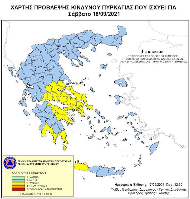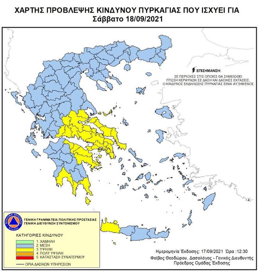 Σύμφωνα με το Χάρτη Πρόβλεψης Κινδύνου Πυρκαγιάς που εκδίδει η Γενική Γραμματεία Πολιτικής Προστασίας του Υπουργείου Εσωτερικών και Διοικητικής Ανασυγκρότησης, για σήμερα Σάββατο 18 Σεπτεμβρίου, προβλέπεται υψηλός κίνδυνος πυρκαγιάς (κατηγορία κινδύνου 3), σε Αττική και Κύθηρα, Εύβοια, Βοιωτία, Φθιώτιδα, Φωκίδα, Αργολίδα, Κορινθία, Χανιά και σε περιοχές Μαγνησίας, Αιτωλοακαρνανίας, Αχαΐας, Λακωνίας και της Μεσσηνίας.