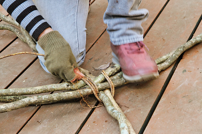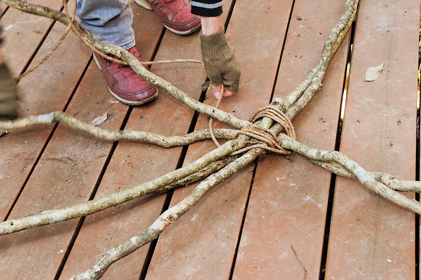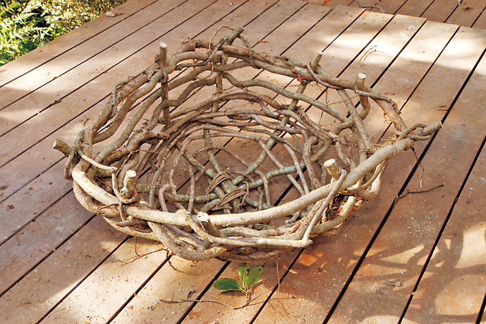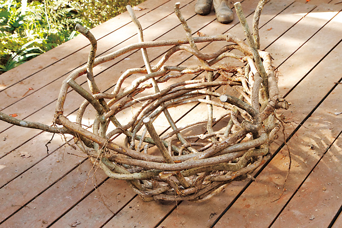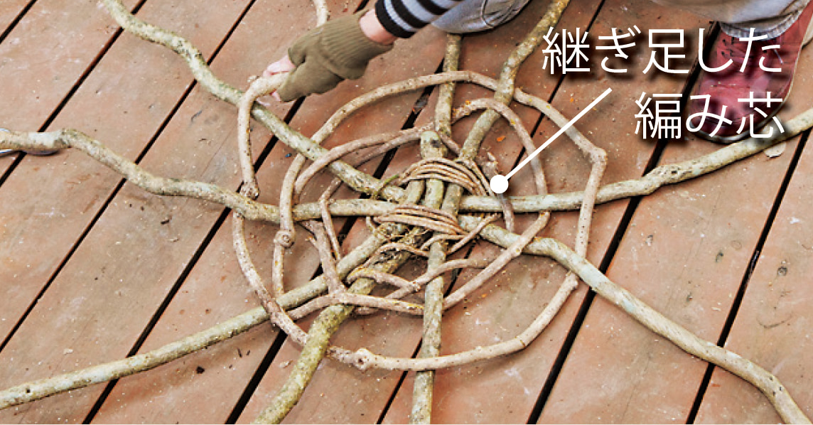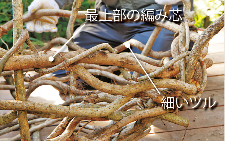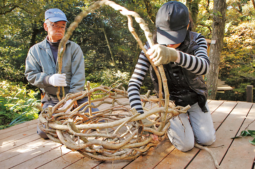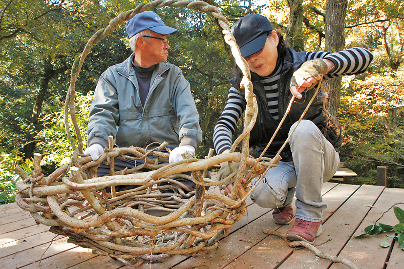 初冬の某週末。この日は房総・いすみ市の「ドゥーパ!ベース」に読者&編集スタッフが集まって、楽しいツルかごつくりのワークショップ。講師の大東悠子さんによれば、「山でツルを採るなら、ツルが休眠状態に入って虫がつきにくい11月から翌年の3月までがいい」とかで、いきなり山でツル採集に突入。木にからみつくツルをなるべく長く切り取る作業は、けっこうワイルドだけど、30分ほどで大量のツルをゲット!いい汗かきました。