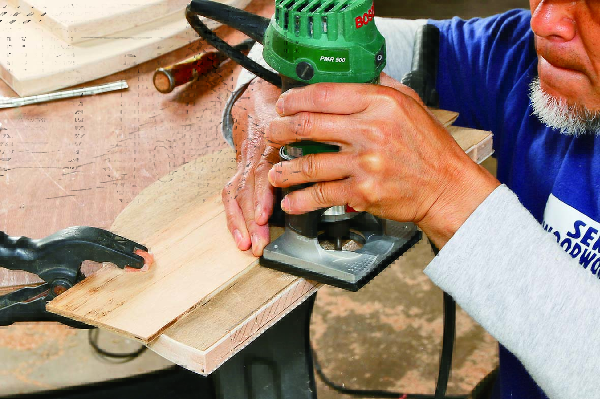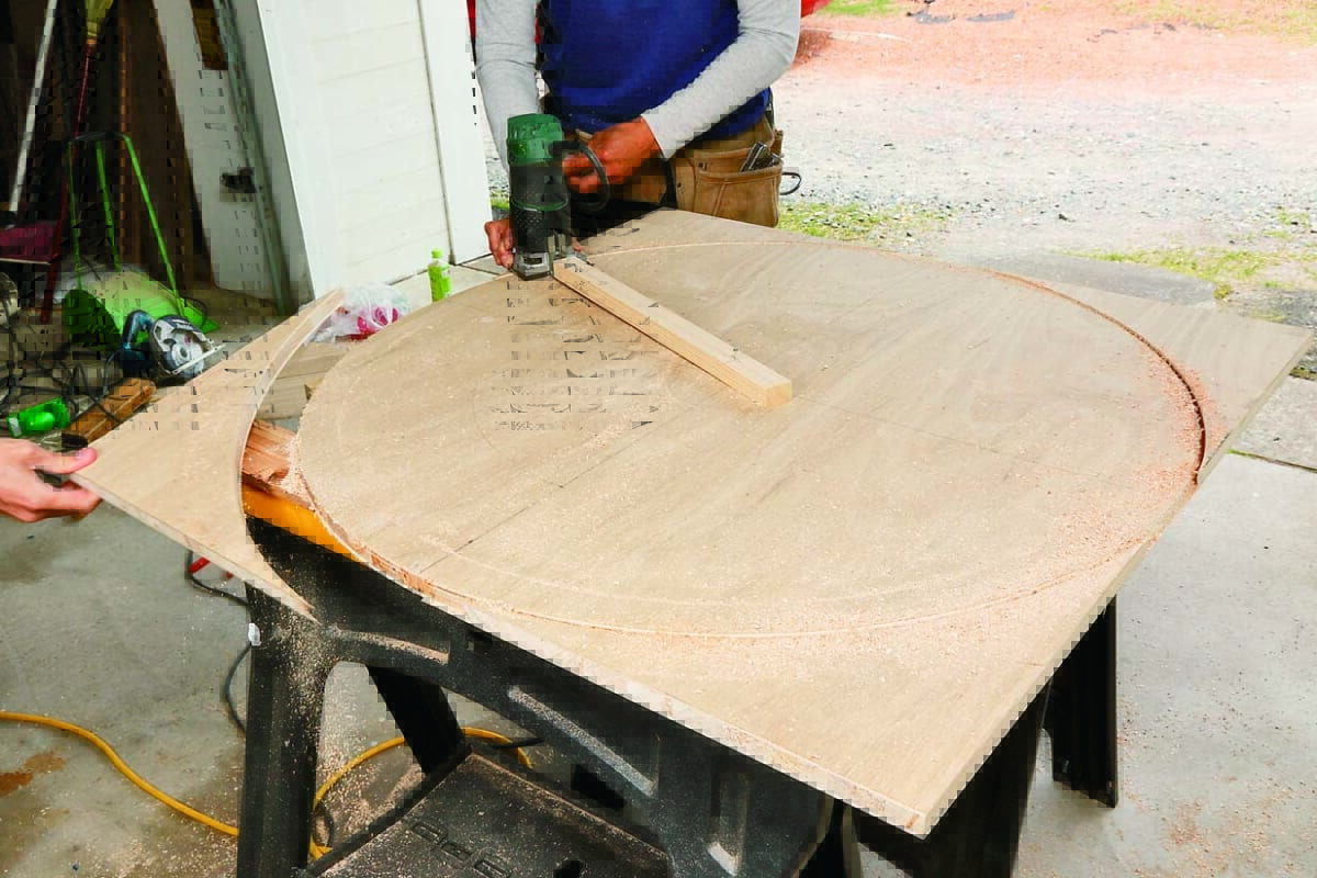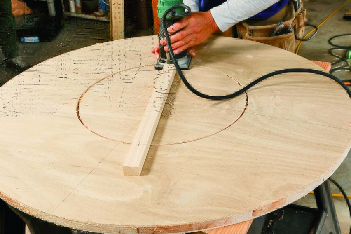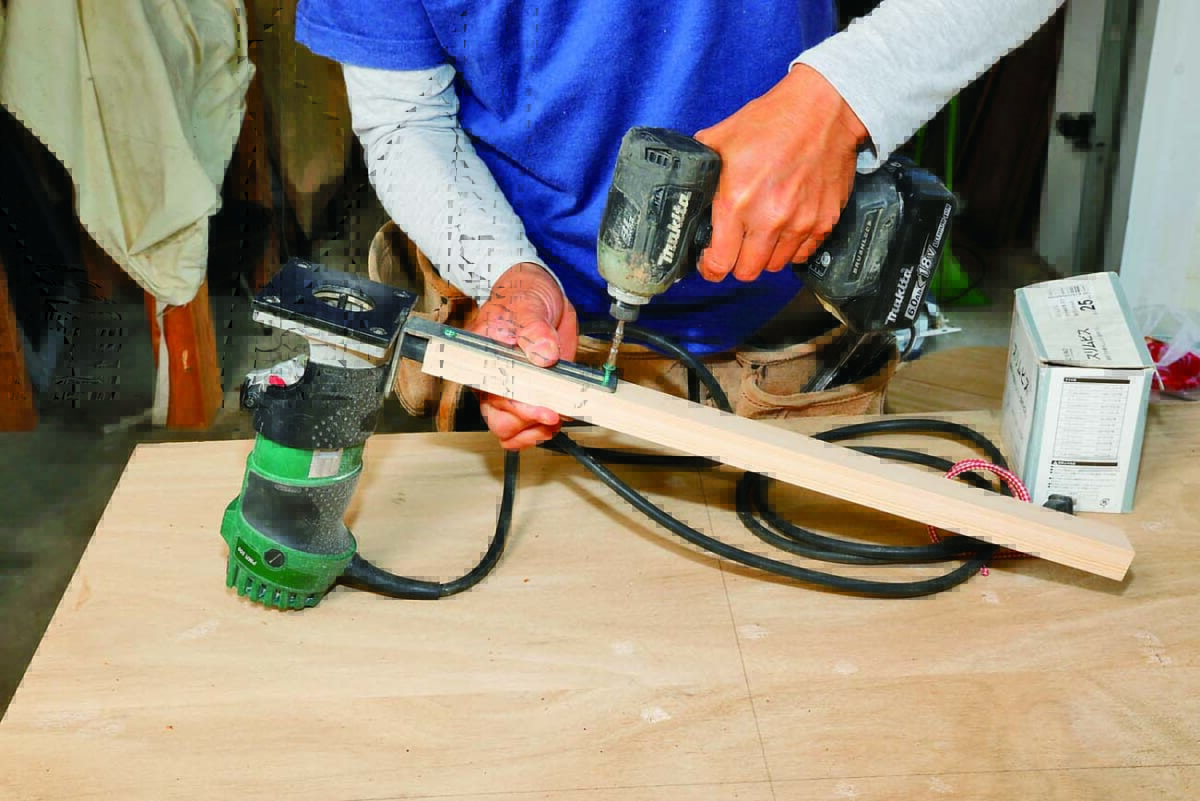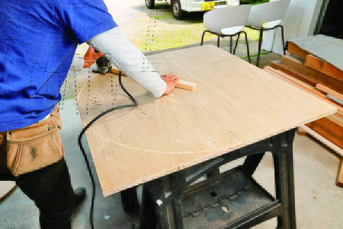材料の加工のポイントはトリマーを使った天板のラウンドカット。付属のストレートガイドからL字のガイドプレートを取り外しトリマー本体に固定。ガイドプレートには角材を取りつけ延長。材の中心から時計の針を回すように材を切削していく。6mm径のストレートビットで切削するので、一度に彫れる深さは3mm。7回ほど切削を繰り返して丸く切り抜いた。