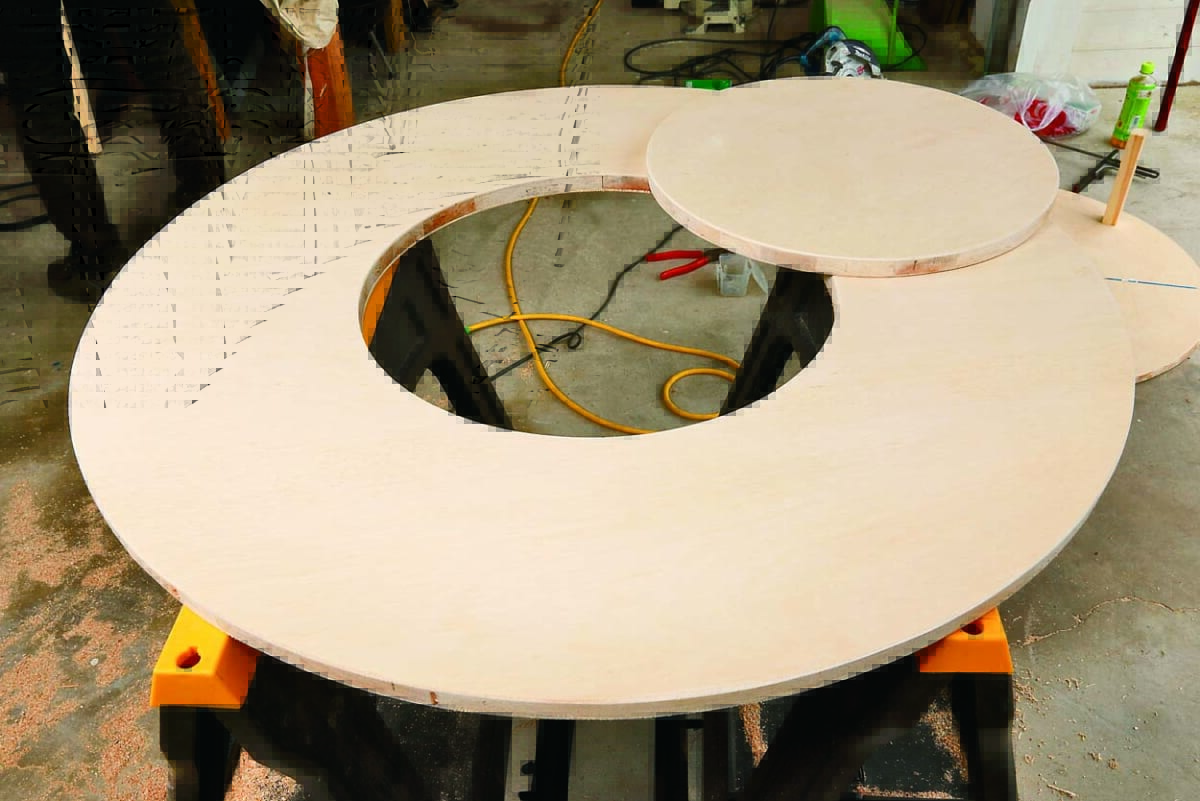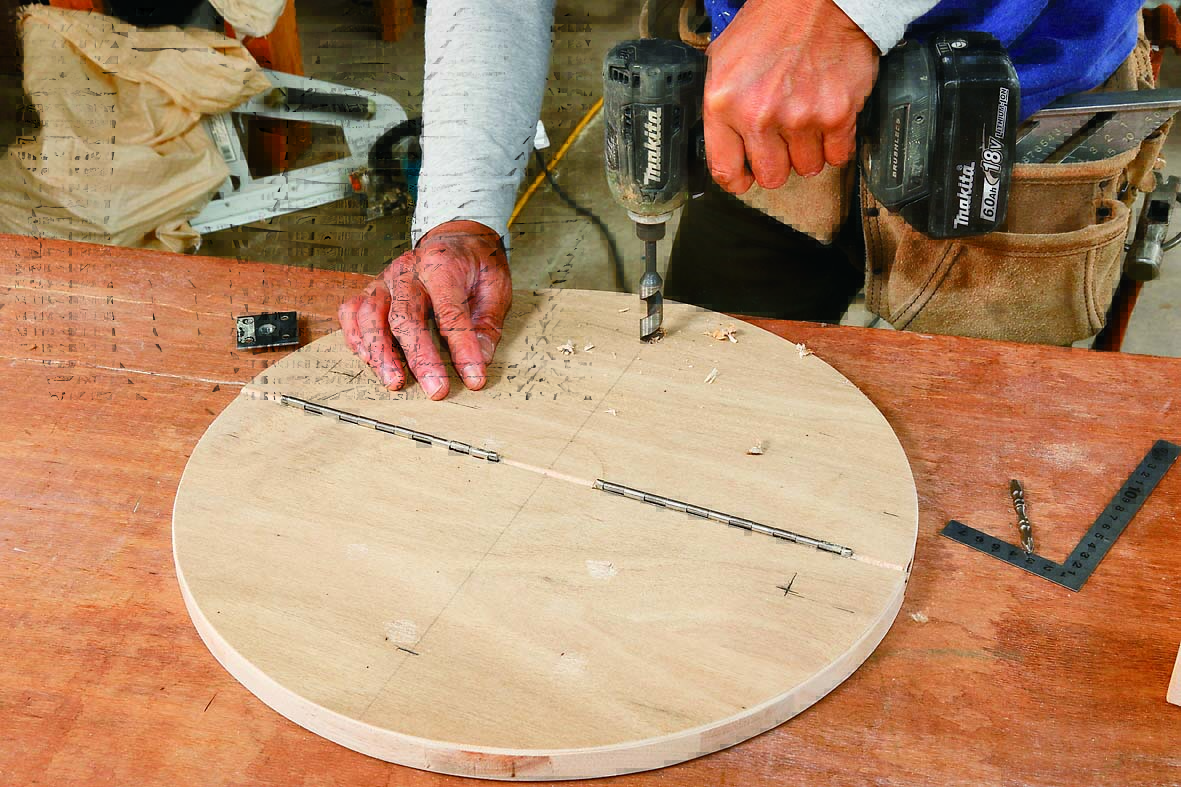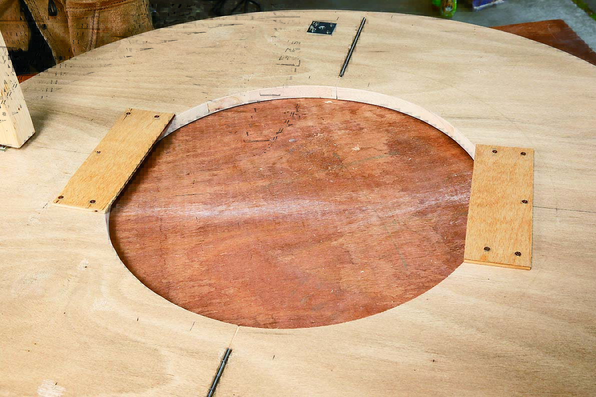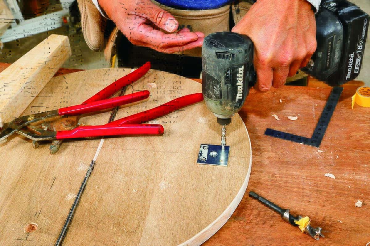 材料の加工のポイントはトリマーを使った天板のラウンドカット。付属のストレートガイドからL字のガイドプレートを取り外しトリマー本体に固定。ガイドプレートには角材を取りつけ延長。材の中心から時計の針を回すように材を切削していく。6mm径のストレートビットで切削するので、一度に彫れる深さは3mm。7回ほど切削を繰り返して丸く切り抜いた。