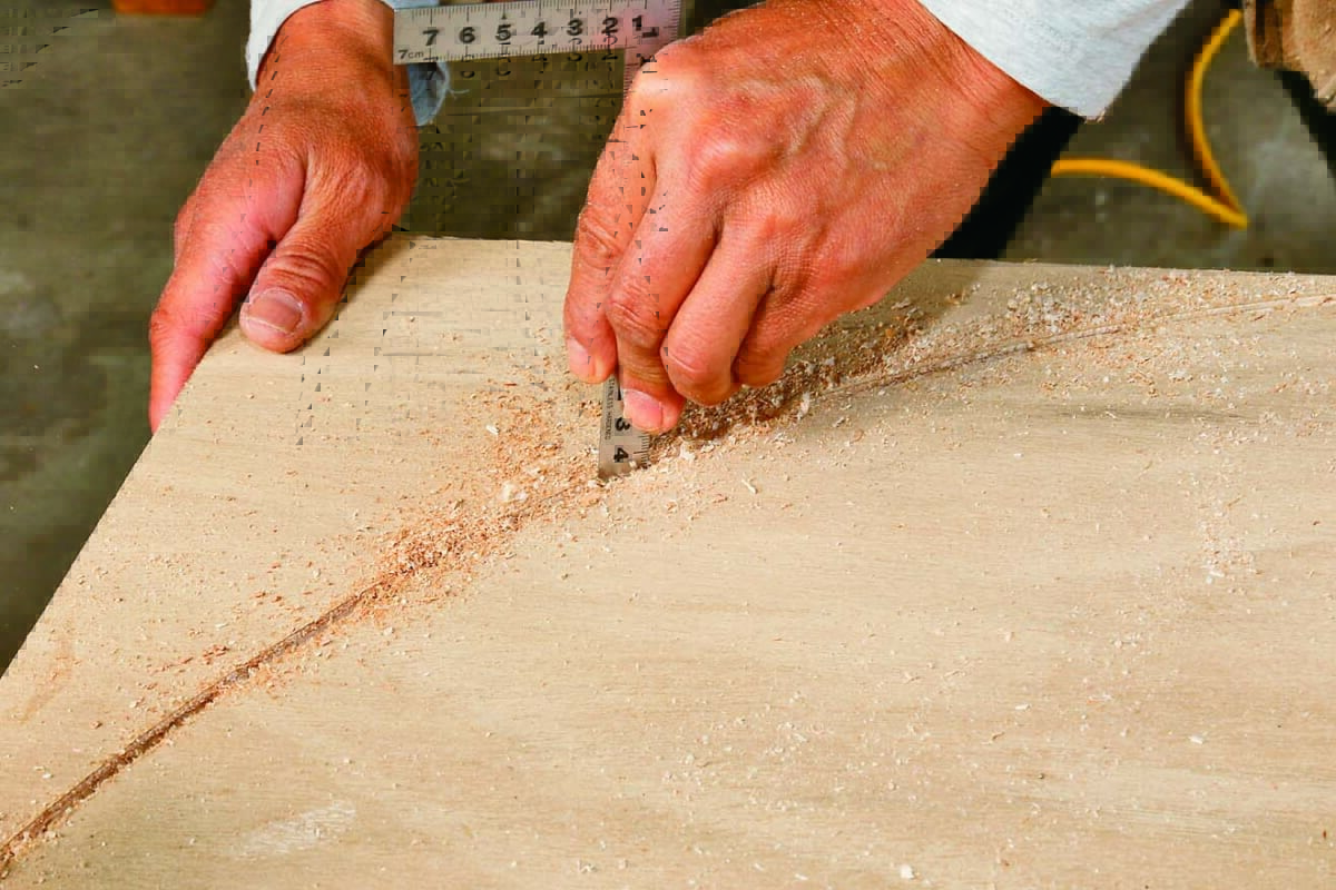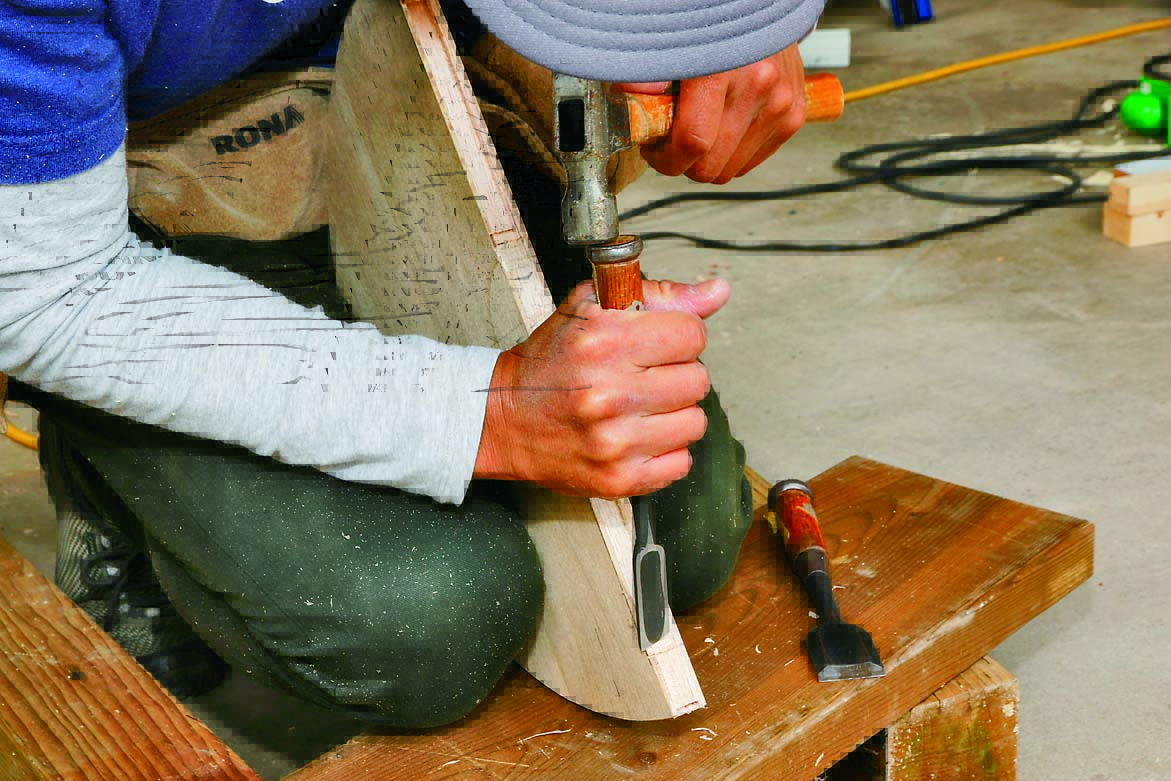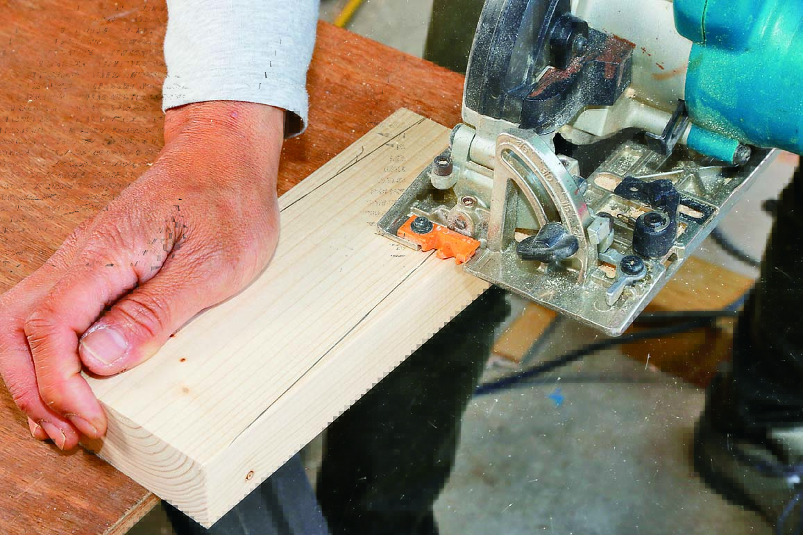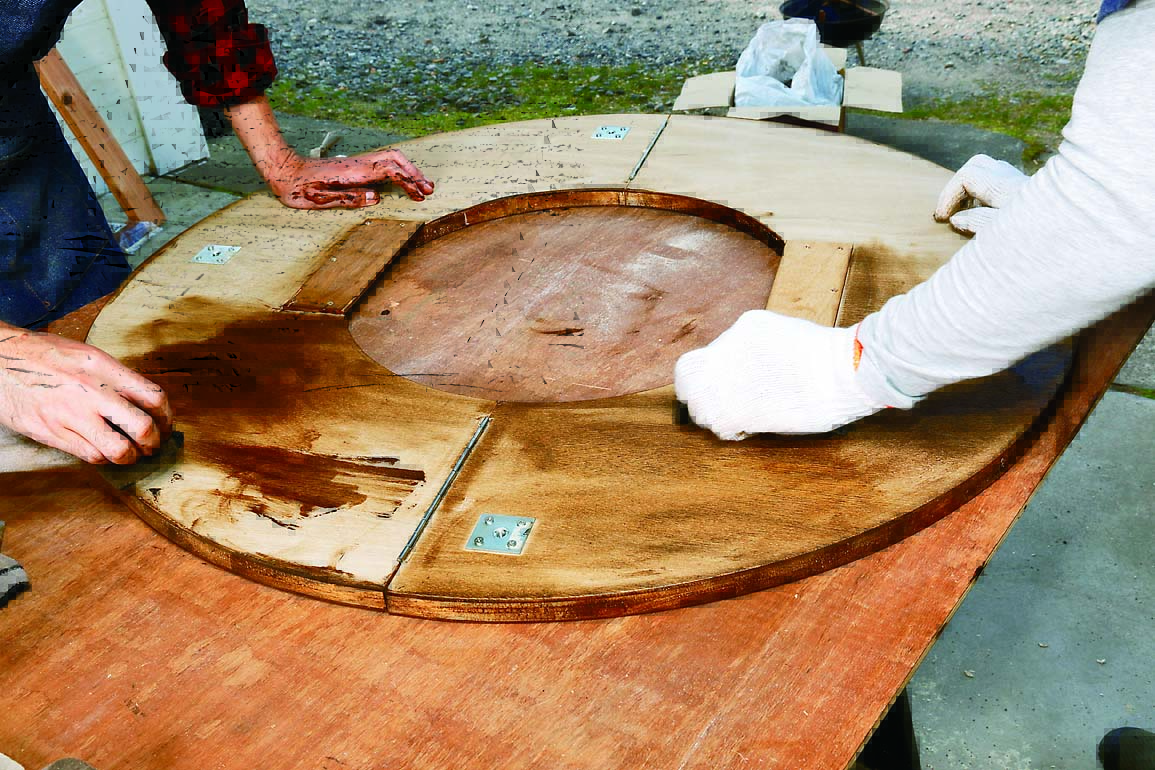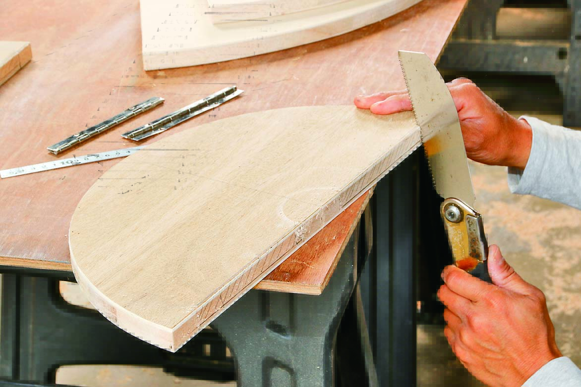 材料の加工のポイントはトリマーを使った天板のラウンドカット。付属のストレートガイドからL字のガイドプレートを取り外しトリマー本体に固定。ガイドプレートには角材を取りつけ延長。材の中心から時計の針を回すように材を切削していく。6mm径のストレートビットで切削するので、一度に彫れる深さは3mm。7回ほど切削を繰り返して丸く切り抜いた。