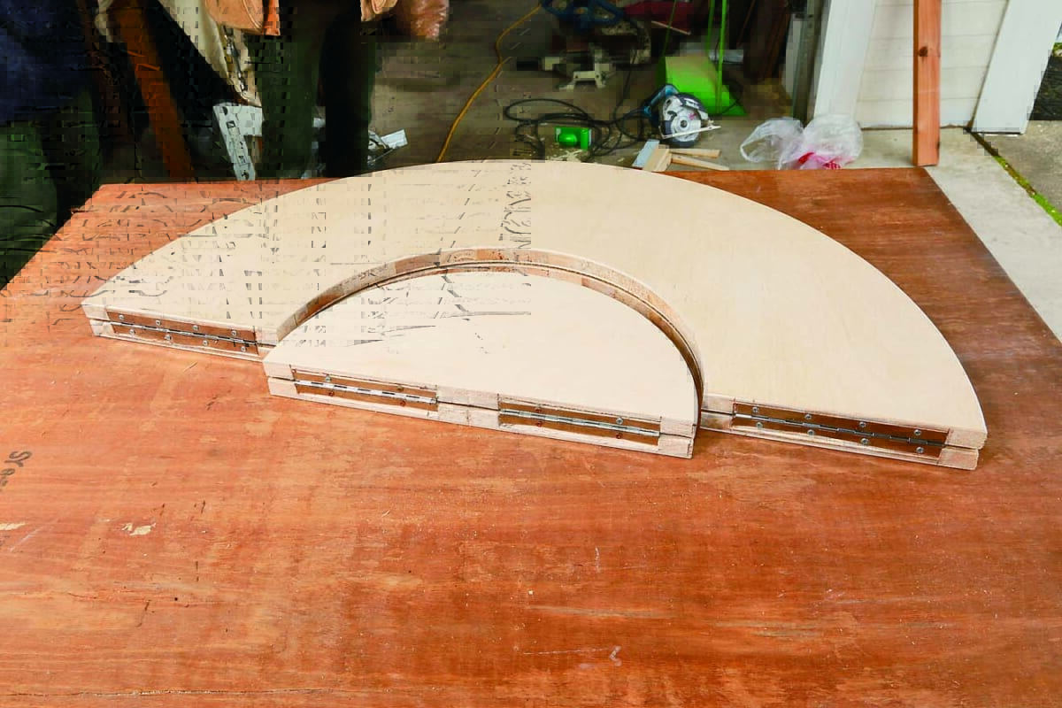 市販の丸形バーベキューコンロから着想を得た、ドーナッツ型のバーベキューテーブルセット。バーベキューをやらないときは、サイドテーブルと一体化したちゃぶ台スタイルに。それぞれの天板は蝶番で接合されているので半分に折りたため、脚を取り外して持ち運ぶことができる。