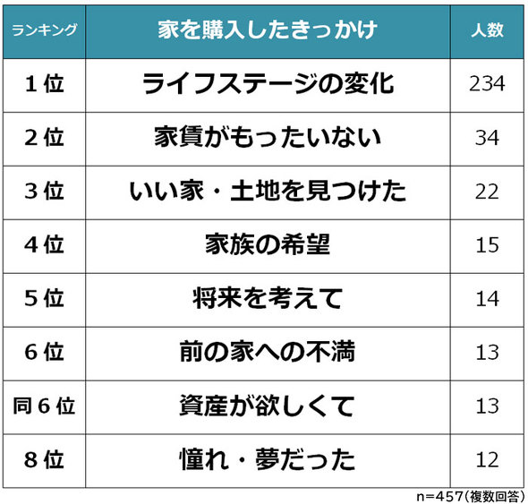 家を購入したきっかけを尋ねると、「ライフステージの変化」(234人)が最も多く、「家賃がもったいない」(34人)、「いい家・土地を見つけた」(22人)と続いた。