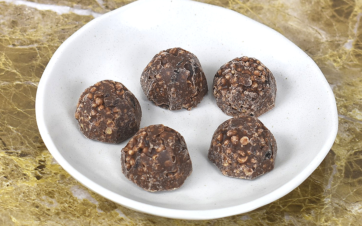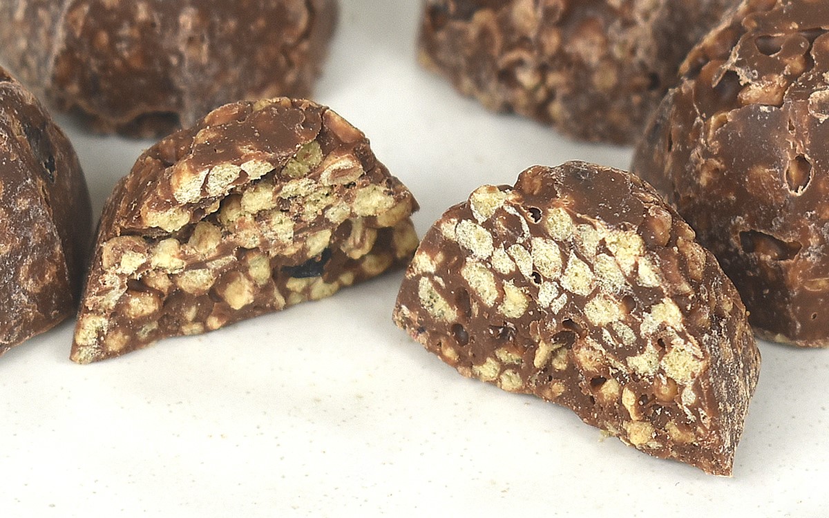 チョコを真っ二つにカットするとわかりやすいのですが、ご覧のとおり中には大豆パフがぎっしり。そのためチョコのしっとりなめらかな舌触りとともに、パフ特有のサクサクとした食感も存分に楽しむことができました。