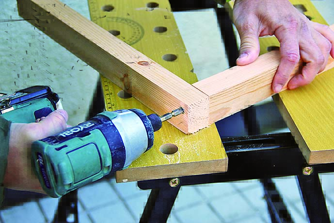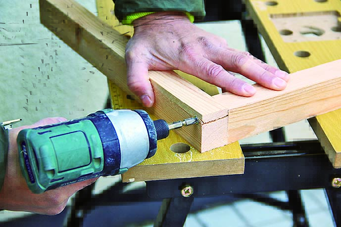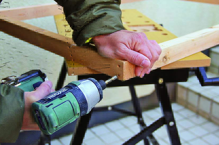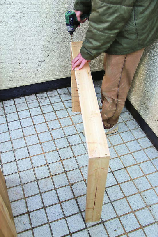 材の端部にスリムビスでなく普通サイズのビスを打つ場合、ドリルで下穴をあけておけば割れを防げる。ビス径より0.5mmほど細いドリルを使うといい。