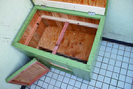 上蓋を開けたときの保持のためにステーを、閉めたときの密閉性アップのためにパッチン錠をつけた。今回は扉の留め具や取っ手に端材を使ったが、お好みならそれらを金具にしてもいい。鍵をかけられるようにしたり、両サイドに持ち手をつけて移設しやすくするのもアリだ。金具によって機能だけでなく見た目の印象も変わることだろう。