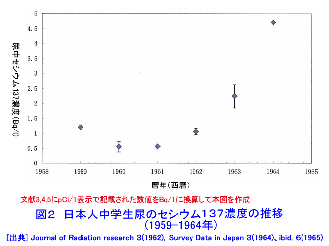 これを見ると、1964年には、5Bq/l近くのセシウムが尿中から排泄されていたことになります。また、この時のセシウム137の体内量は、500ベクレル以上でした。(下の図の1964年のところ)