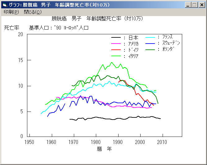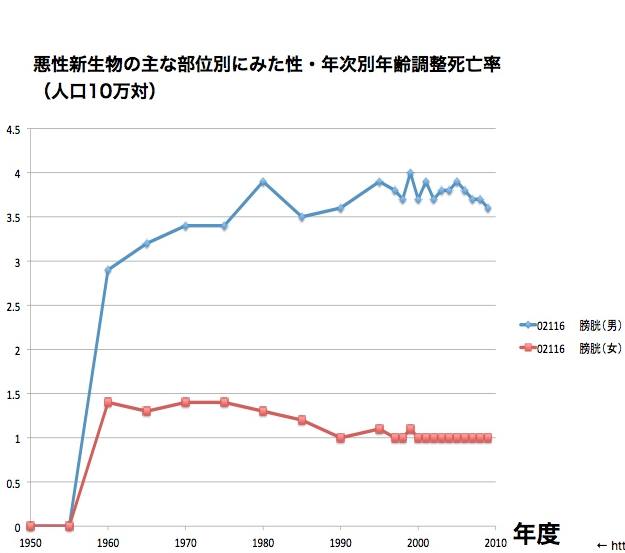上の図を見て分かる通り、膀胱癌による、年齢調整済み死亡率は、1960年代から変わっていない(男性は若干上昇,女性は若干下降)。ちなみに膀胱癌発生率は、日本が飛び抜けて低いそうです。