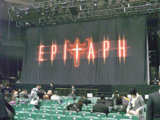 右:入場すると「EPITAPH」のロゴが眩しい暗幕がステージを覆っている。