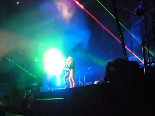 左:レーザー光線が華やかに彩るステージ。