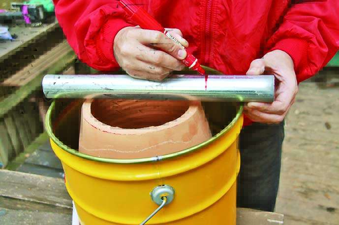 ペール缶(径300×高さ350mm)、テラコッタの鉢(径260×高さ310mm)、パーライト(18L)1袋、バーミキュライト(3L)1袋、川砂(適宜)、単管パイプ(径38mm)、焼き網など*塗料は含まない