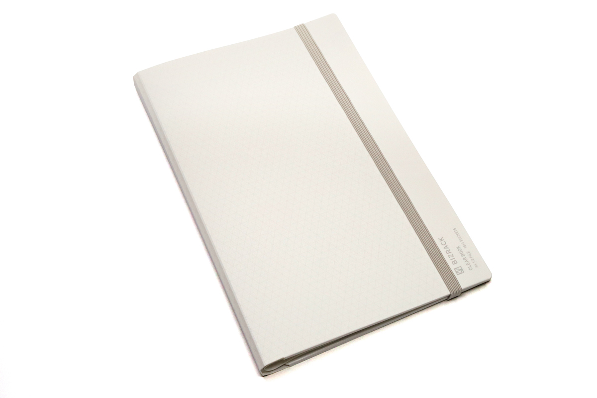 まず「SlideNote」は、背全体を挟む大きなスライドクリップが特徴だったが、この「クリップノート<ビズラック>」は樹脂製の回転クリップを2点に備えている。「SlideNote」はA4以下であればどんなサイズの紙でも綴じることができたが、こちらはクリップが上下端に分かれて配置されているため、基本的にはA4限定と言っていいと思う。