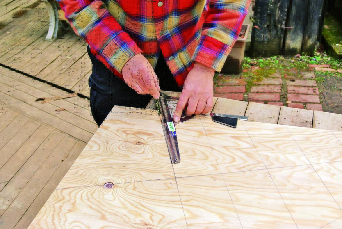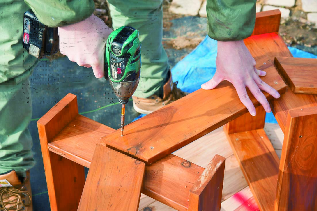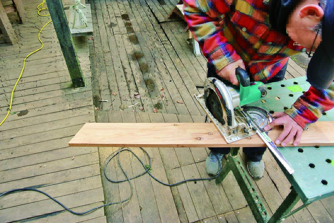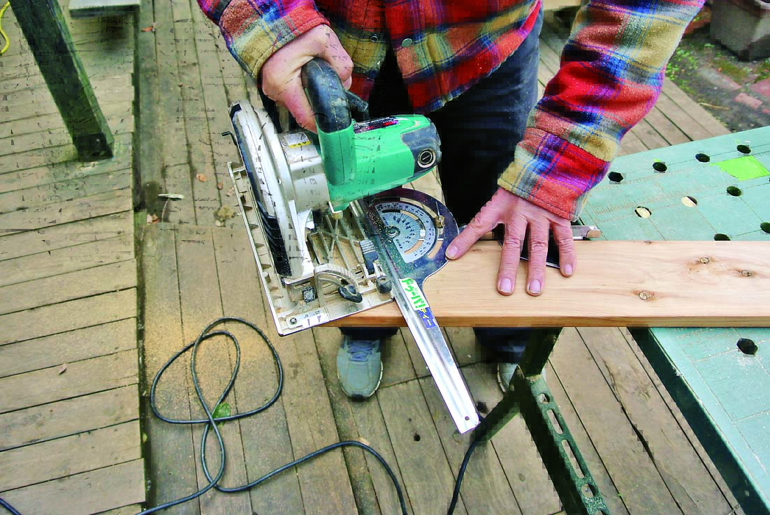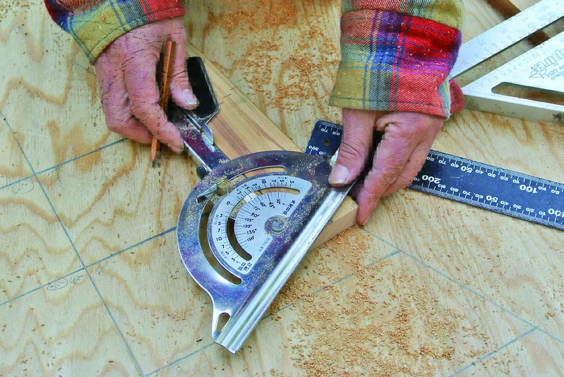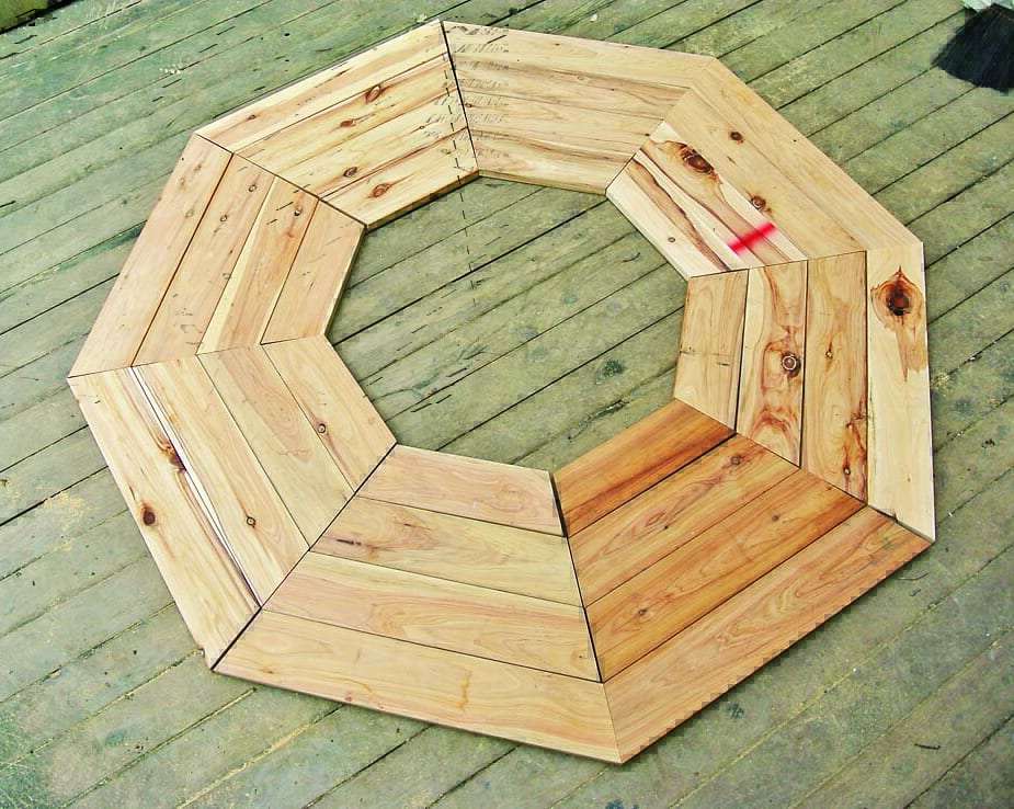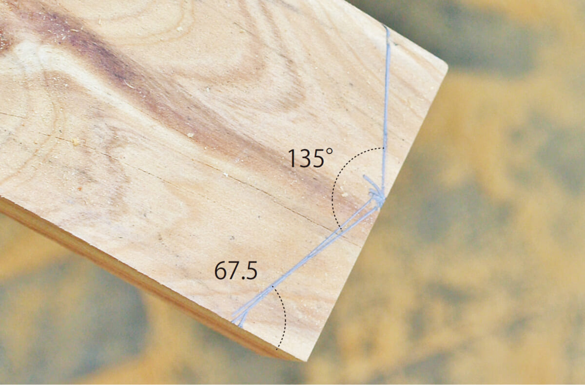 製作の一番のポイントは、角度定規と丸ノコで行なう「角度切り」。八角形なので67.5度の角度切りで材を大量にカットするのだが、少しでも狂うとうまく組めずに座板同士にすき間が生じてしまうといった問題がある。そこで今回は、細い板で座板のつなぎ目を隠すようにし、多少角度が狂っていても見た目にはわからないように設計。角度切りにあまり神経質になる必要はないのでぜひチャレンジしてほしい。