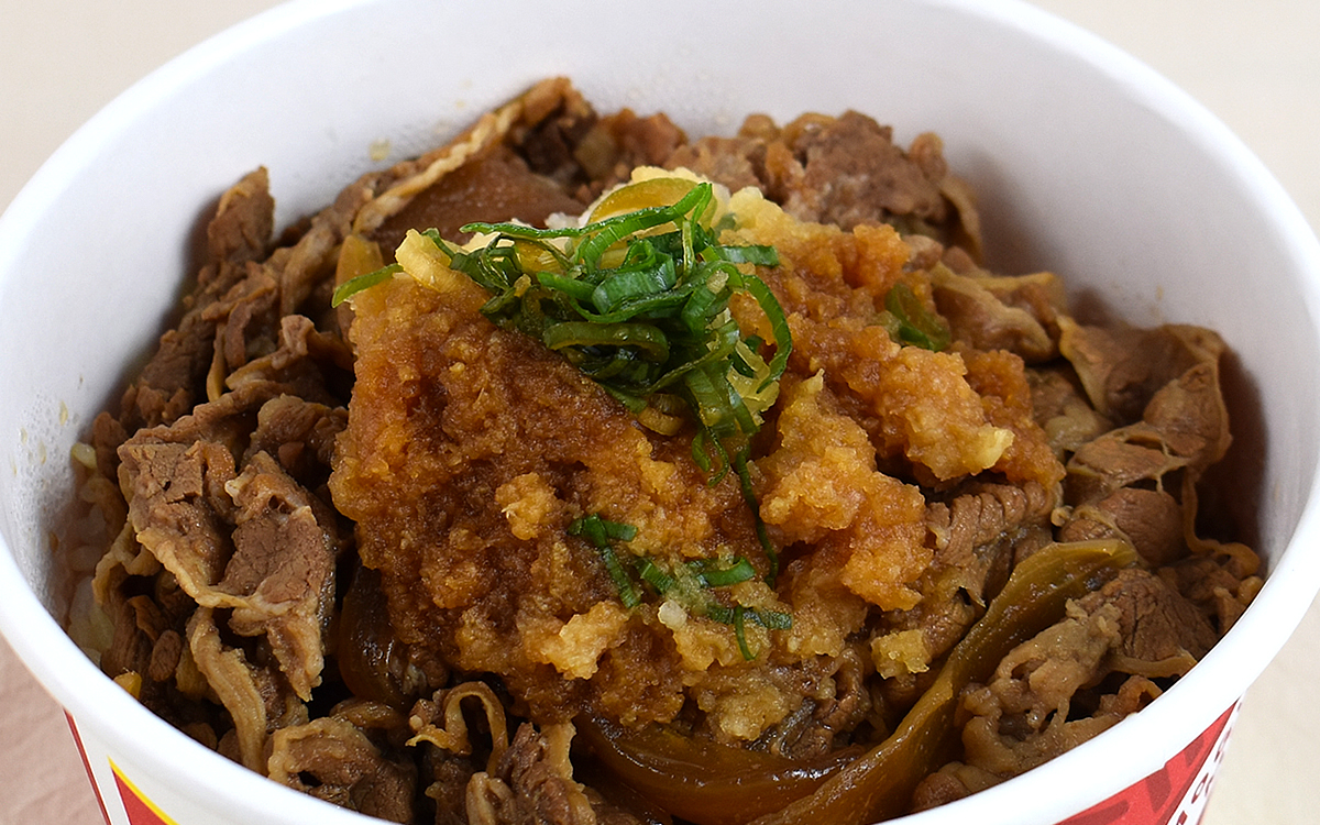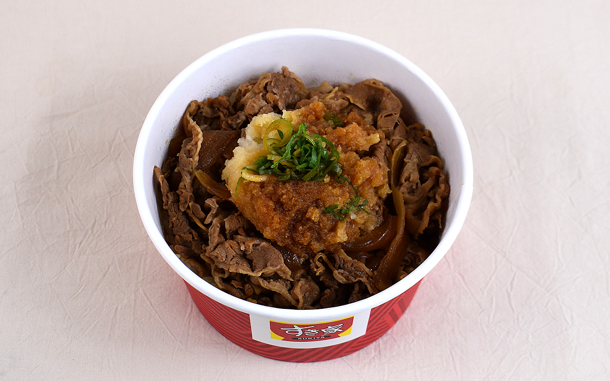 テイクアウトでは牛丼とおろしポン酢がそれぞれ別パッケージになっている同商品。並盛とは思えないほどボリューム感のある牛丼もさることながら、ポン酢が絡む大根おろしも艶があって目を引き寄せられます。ちなみに商品公式ページによると、大根おろしは店舗ですりおろされているそう。
