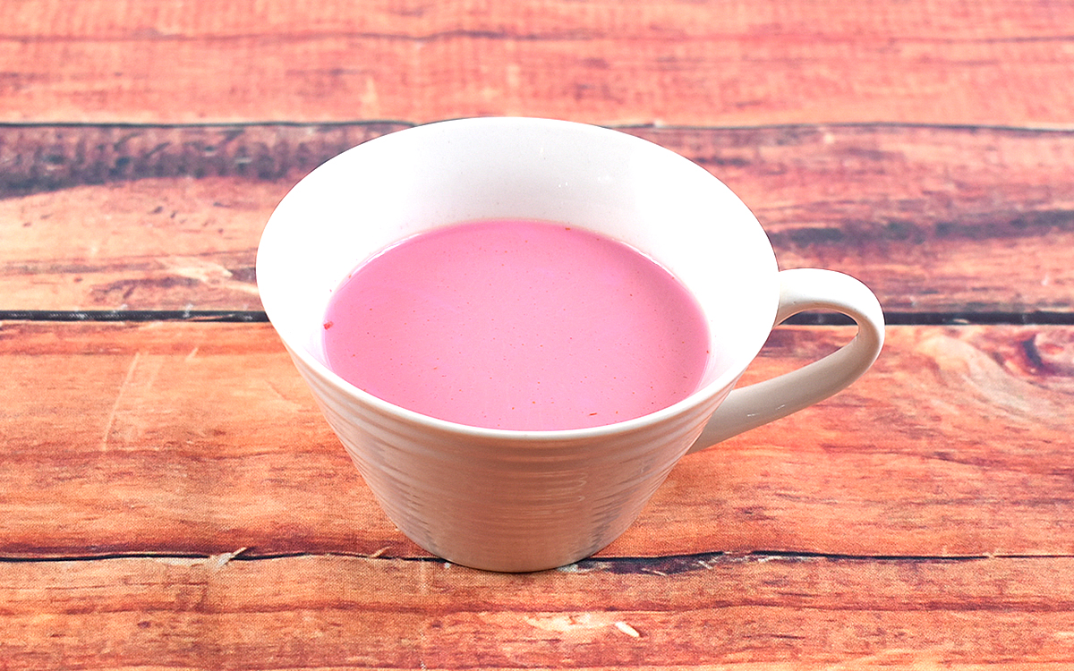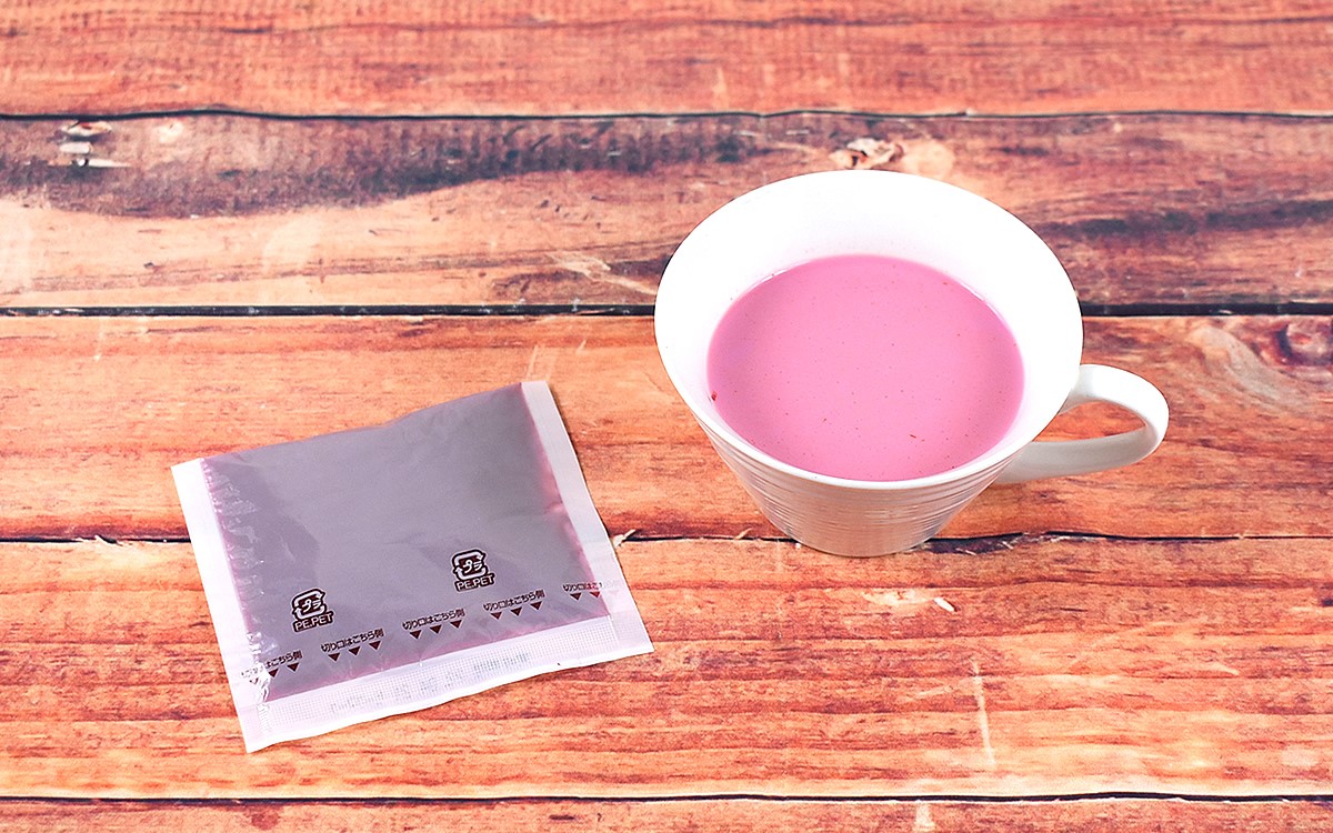 使用されているのは北海道産のビーツ。ペースト状にしたビーツと、トマト・玉ねぎ・チキンエキスなどが配合されているそうです。1人前35g入りの袋が2つ入っており、牛乳や豆乳(1袋につき100ml~130ml)に溶かして完成。あっという間に鮮やかなピンク色のポタージュが完成しました。