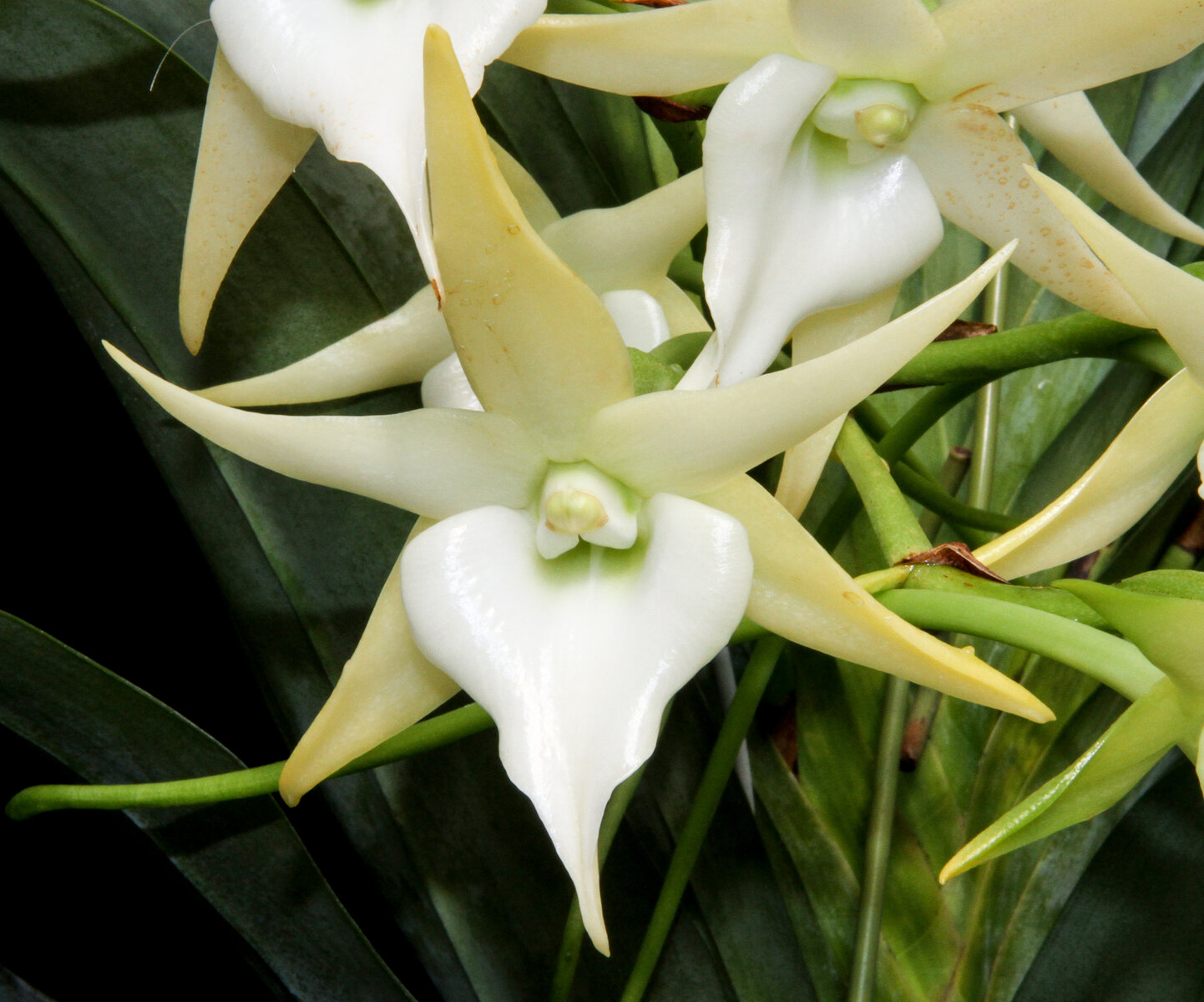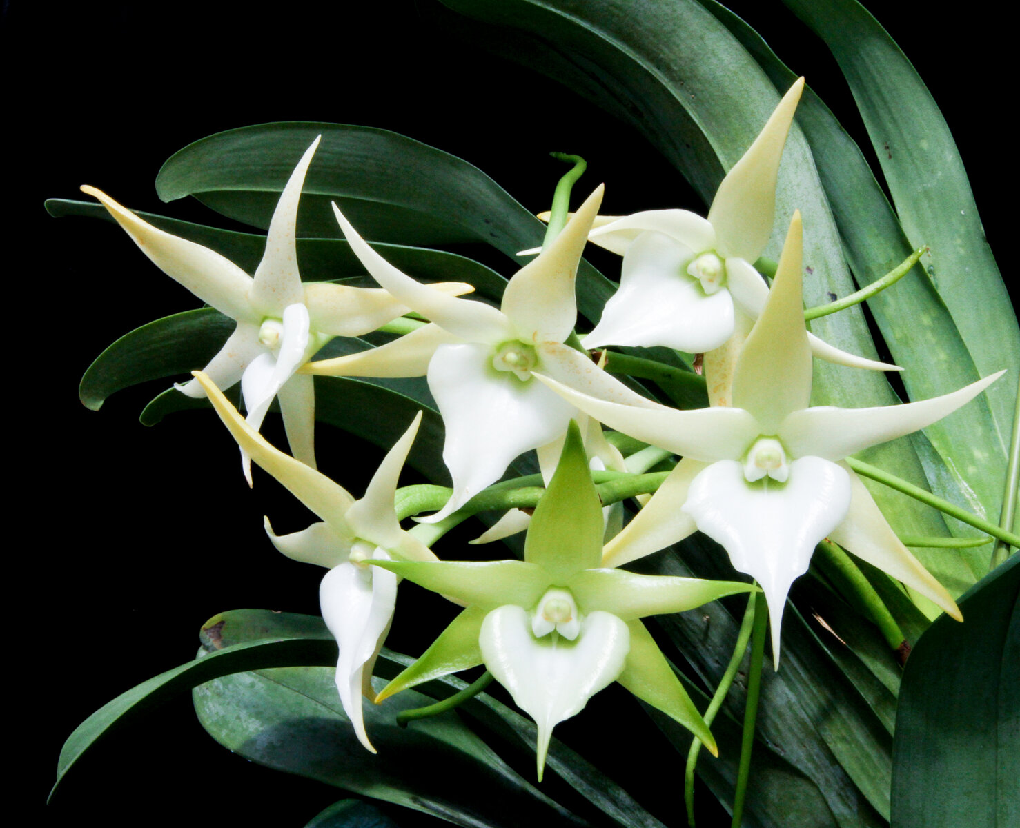 2020.1.19 Angraecum Crestwood ‘Tomrrow Stars’ 昨年頂いたばかりのアングレカムが咲きました。8花茎、23輪です。大株です。 Angraecum Crestwood = Angraecum Veitchii x sesquipedale 炬が長いですね。株元には小苗が沢山出ています。