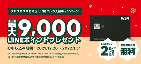 LINE Payは20日、期間中に「Visa LINE Payクレジットカード」(以下、LINEクレカ)の新規入会と特典の条件を達成すると、最大9,000ポイントのLINEポイントをプレゼントする「クリスマス&お年玉LINEクレカ入会キャンペーン」を2021年12月20日(月)から2022年1月31日(月)まで開催すると発表しています。