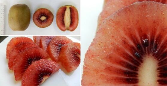 正式な品種名は、‘ZES008’といいます。その最大の特徴は、下の写真のように果心を除く果肉全体が鮮烈な赤色を呈することです。「キウイフルーツは緑や黄色」という既成概念を打ち砕く、インパクトある色調です。これまでにも、レインボーレッドやさぬきエンジェルスイートなどの赤色色素を含む品種はありましたが、ゼスプリ・レッドの果肉の赤さは群を抜いています。