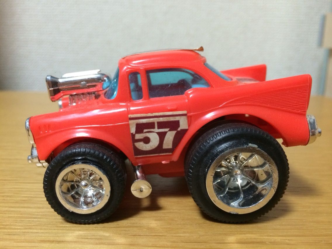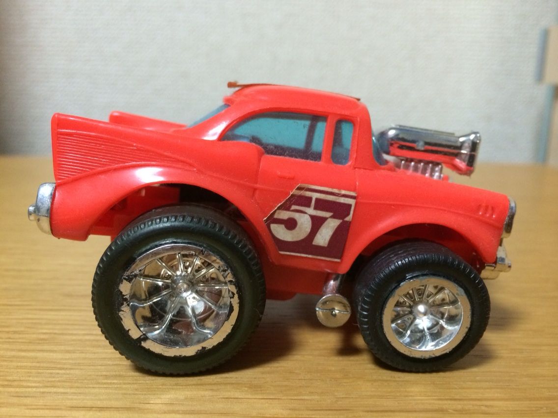 大きさは10cmくらいでしょうか、プラ製のボディにABS製のシャシー。フリクション、いわゆるプルバックで走らせる事が出来るため状態の良い物にはなかなかお目にかかれず、ステッカー違いのカラーバリエーションも存在するからそれはもう。