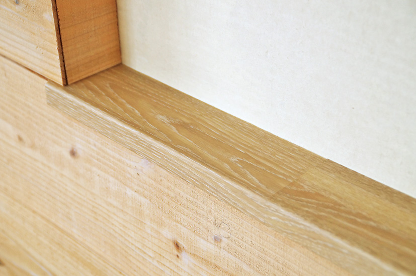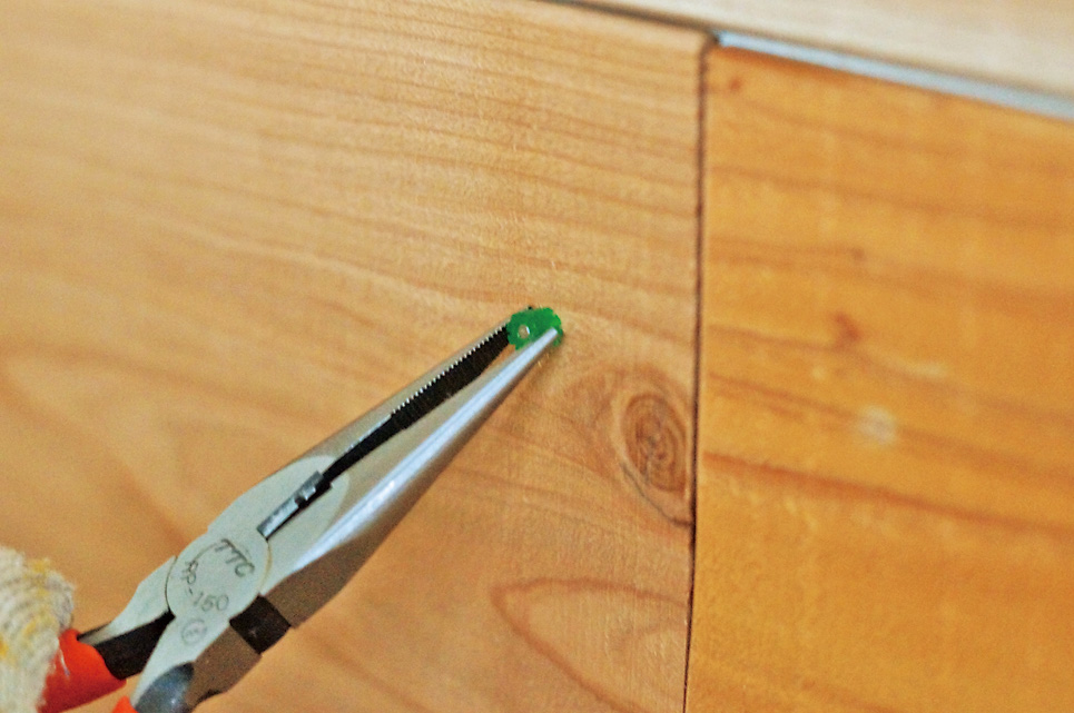 作業は、まず壁紙&幅木の剥がしからスタート。その後はひたすら板材張り。接着剤を塗った板材を壁に張り、仮クギで打つ。接着剤が乾いたら仮クギを外すだけ。この簡単DIYで、あっという間に山小屋のような壁に変身させられるのだ!