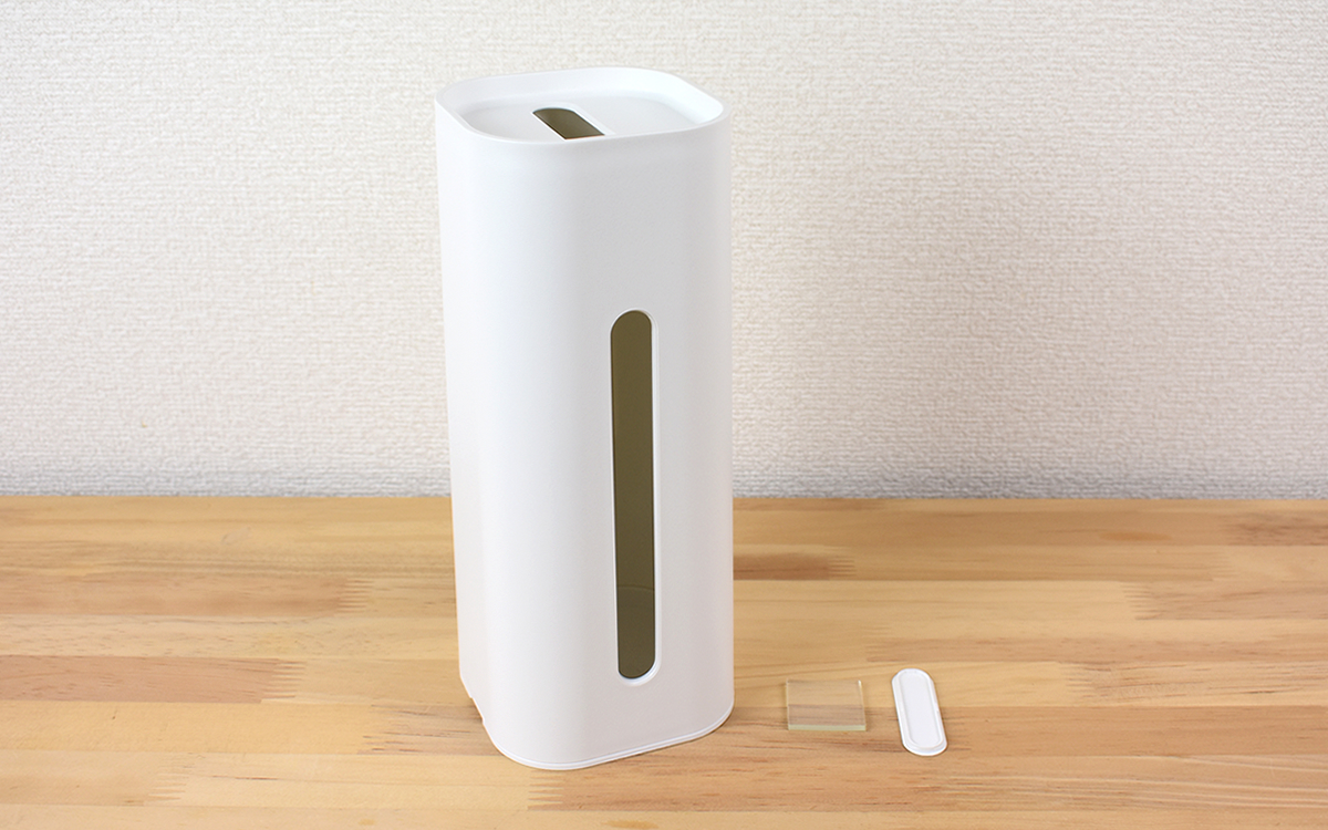 同商品のサイズは10(幅)×10(奥行)×24cm(高さ)。塔のようなスリムボディで、上面と側面には細長い口が開けられています。なお私が選んだのはホワイトカラーですが、落ち着いたトーンのグレータイプも展開されているのでお好みのカラーを選んでくださいね。