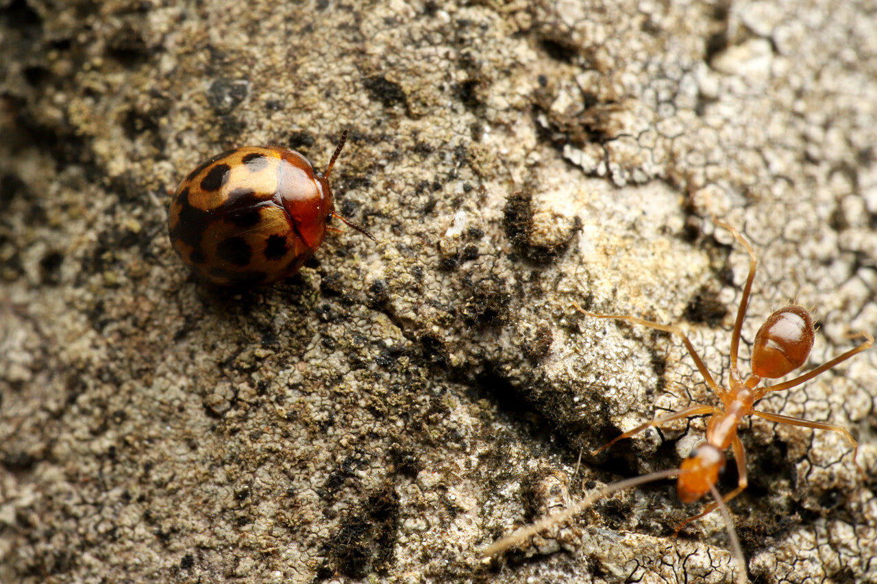 アシナガキアリは石垣の隙間などに巣を作ることが多いのですが、その周りにたくさんいるテントウムシのような虫。