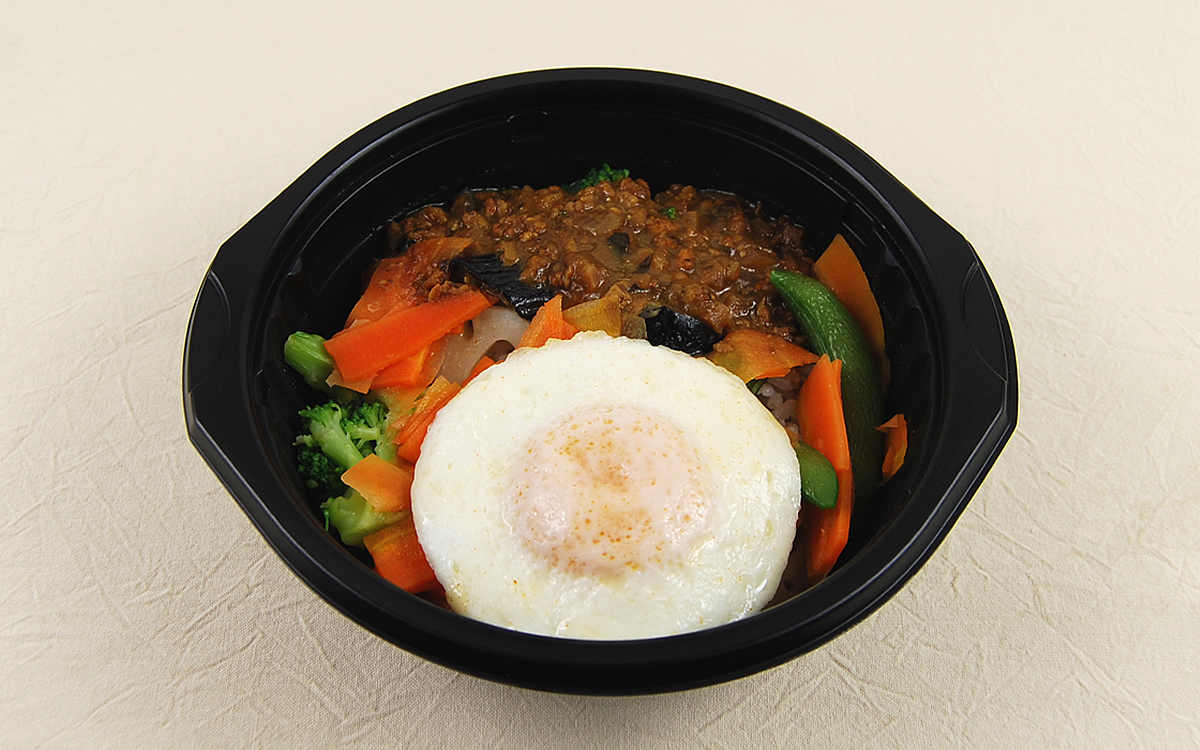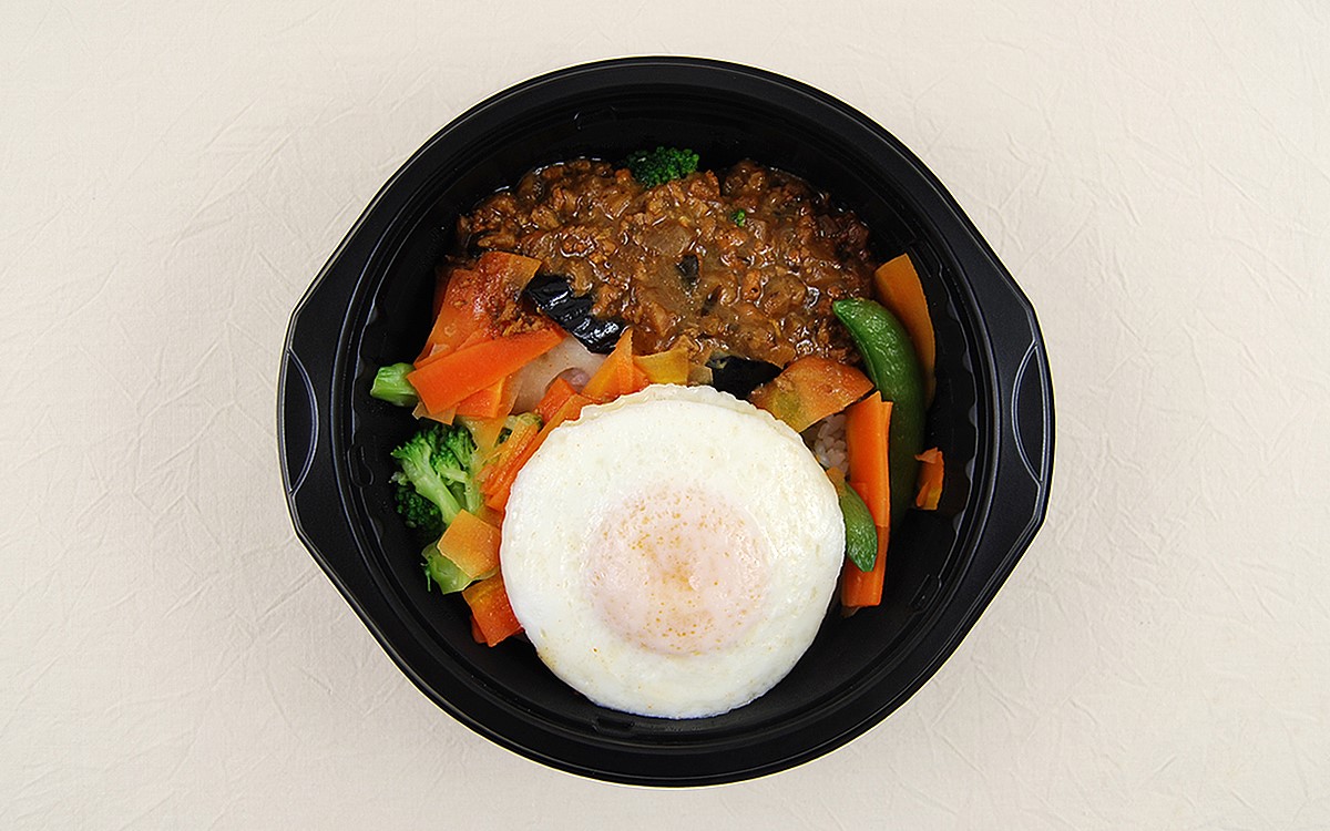 厚生労働省の「健康日本21」によると、1日あたりの野菜摂取量の目標は350g以上。同商品ではその3分の1以上である120gを摂ることができます。なす・にんじん・ブロッコリー・れんこん・スナップえんどうなどの野菜がトッピングされているほか、ご飯には食物繊維が豊富なもち麦を配合しているのもうれしいポイント。