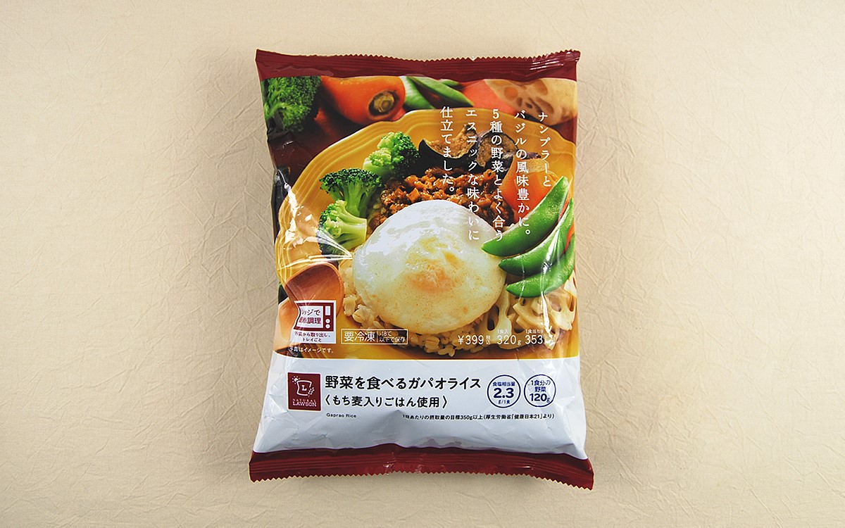 ピリ辛好きにはたまらない、特有の香辛料やクセになる風味を味わえるエスニック料理。ローソンではタイ料理の中で特に人気の高いガパオライスが冷凍食品として登場しています。今回購入した「野菜を食べるガパオライス」(399円/税込)は、一品で1食分の野菜が摂れる商品。一体どのような味わいを楽しめるのでしょうか?