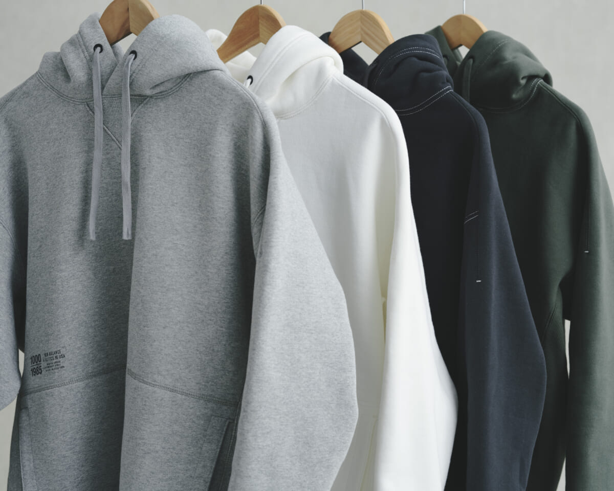 袖付けは、前はセットインスリーブ、後ろはラグランスリーブのスプリットラグランスリーブ。腕の動かしやすさとシルエットの美しさを目指したパターンです。フーディはかぶり心地と立ち上がりの美しさにこだわっています。パンツも、レギュラーフィットは程よくゆとりがあるスマートなテーパードシルエット、オーバーサイズフィットは腰や腿はゆとりがありながらも裾まわりはすっきりさせたシルエットです