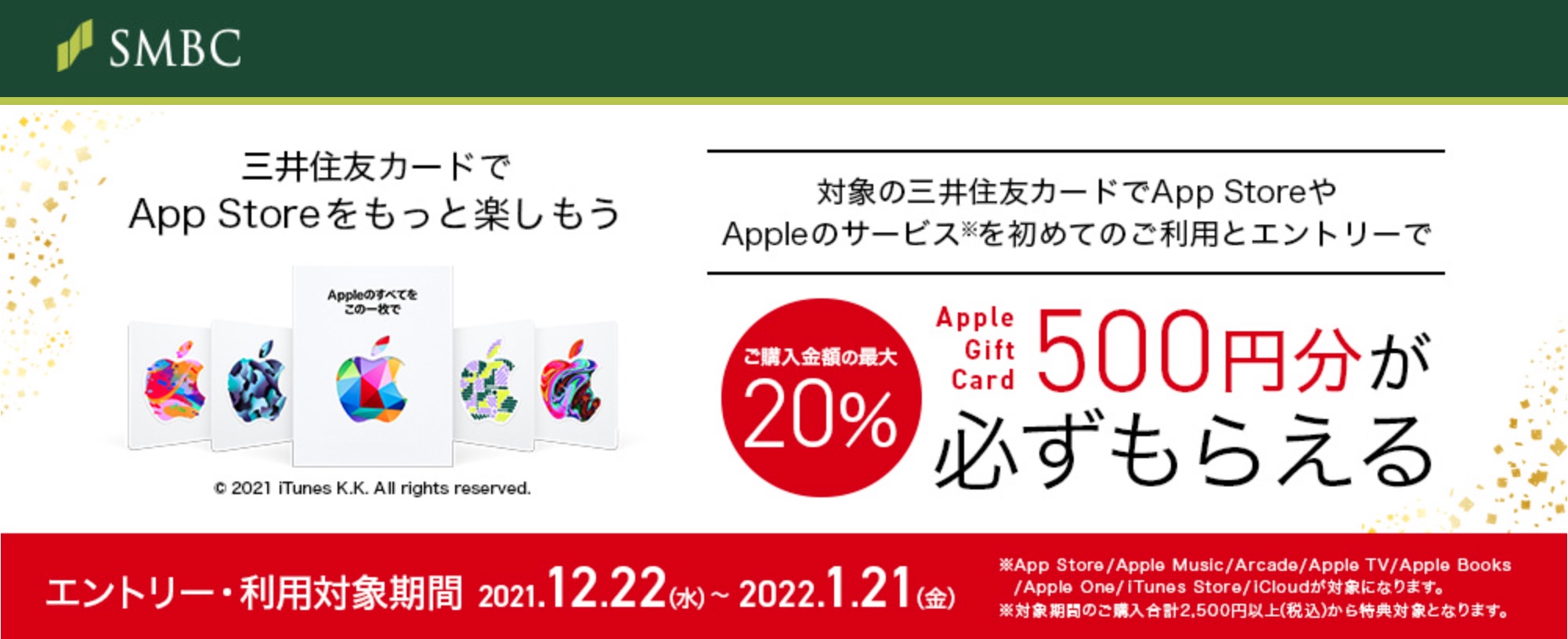 キャンペーンでは対象カードでキャンペーンWebページ( https://www.smbc-card.com/rd/92751.jsp )からエントリーの上、対象カードをApple IDに登録して対象期間内にApp Storeなどで合計2,500円(税込)以上利用するともれなく最大20%分となる500円分のApple Gift Cardがプレゼントされます。