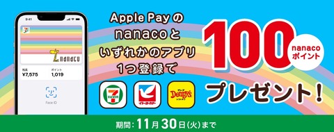 合わせてApple Payにてnanacoを登録(新規発行または既存の磁気カードから読み取り)し、セブン‐イレブンアプリまたはイトーヨーカドーアプリ、デニーズアプリのうちいずれか1つのアプリにApple Payに登録したnanaco番号を新たに登録(または変更)すると100ポイントがもらえるキャンペーンを実施しています。期間は2021年11月30日(火)まで。