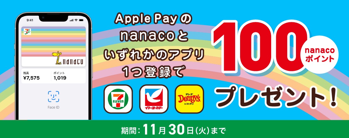 合わせてApple Payにてnanacoを登録(新規発行または既存の磁気カードから読み取り)し、セブン‐イレブンアプリまたはイトーヨーカドーアプリ、デニーズアプリのうちいずれか1つのアプリにApple Payに登録したnanaco番号を新たに登録(または変更)すると100ポイントがもらえるキャンペーンを実施しています。期間は2021年11月30日(火)まで。