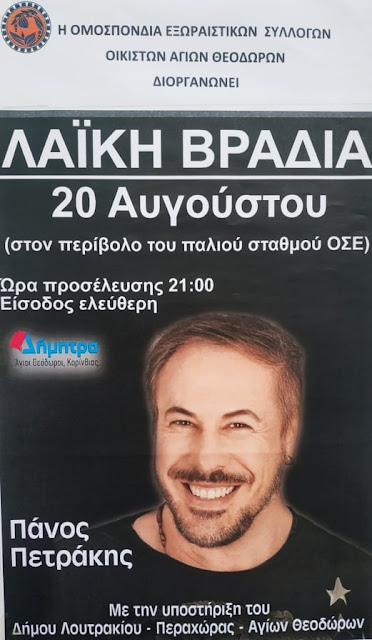 Μετά από πολύ καιρό, λόγω πανδημίας η Ομοσπονδία Εξωραϊστικών Συλλόγων Αγίων Θεοδώρων, διοργάνωσε το βράδυ της Παρασκευής 20 Αυγούστου, μια εξαιρετική εκδήλωση, στο παλιό σταθμό του τρένου των Αγίων Θεοδώρων, τηρώντας βέβαια όλα τα μέτρα προστασίας που επιβάλλει το νόμος. Ο Πρόεδρος Δημήτρης Σαρέλας και το Δ.Σ. της Ομοσπονδίας επιθυμεί να ευχαριστήσει θερμά όλους όσους παρευρέθηκαν στην εκδήλωση, καθώς επίσης τον Δήμο Λουτρακίου-Περαχώρας-Αγίων Θεοδώρων και το βιβλιοπωλείο Δήμητρα, για την αρωγή και την υποστήριξη που προσέφεραν στην Ομοσπονδία για την οργάνωση της εκδήλωσης.