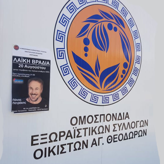 Μετά από πολύ καιρό, λόγω πανδημίας η Ομοσπονδία Εξωραϊστικών Συλλόγων Αγίων Θεοδώρων, διοργάνωσε το βράδυ της Παρασκευής 20 Αυγούστου, μια εξαιρετική εκδήλωση, στο παλιό σταθμό του τρένου των Αγίων Θεοδώρων, τηρώντας βέβαια όλα τα μέτρα προστασίας που επιβάλλει το νόμος. Ο Πρόεδρος Δημήτρης Σαρέλας και το Δ.Σ. της Ομοσπονδίας επιθυμεί να ευχαριστήσει θερμά όλους όσους παρευρέθηκαν στην εκδήλωση, καθώς επίσης τον Δήμο Λουτρακίου-Περαχώρας-Αγίων Θεοδώρων και το βιβλιοπωλείο Δήμητρα, για την αρωγή και την υποστήριξη που προσέφεραν στην Ομοσπονδία για την οργάνωση της εκδήλωσης.