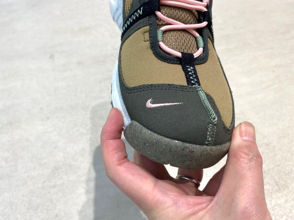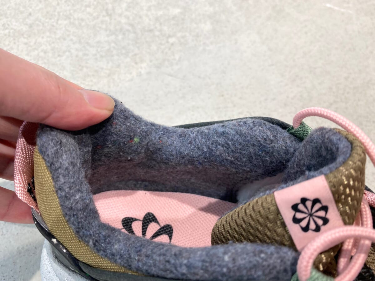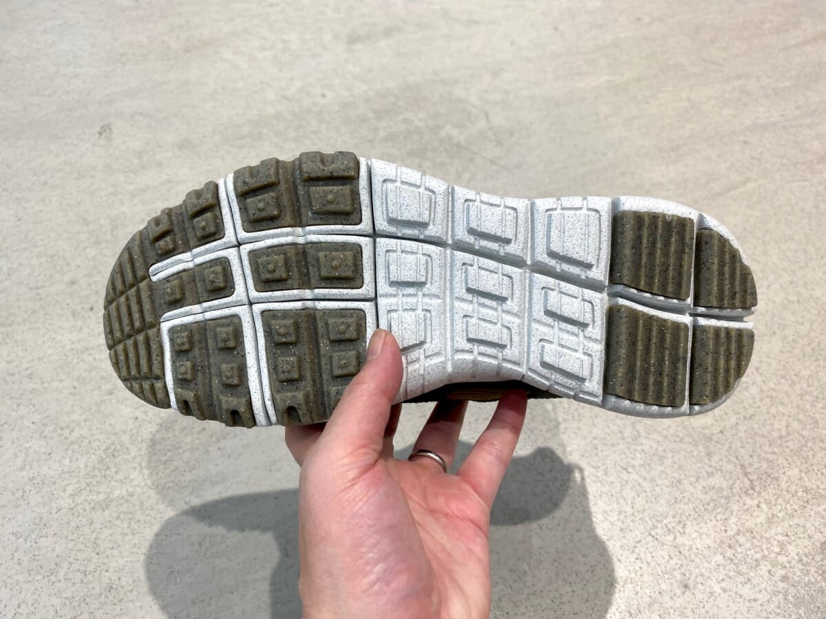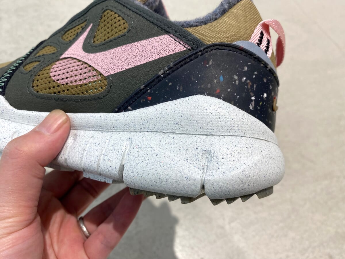 ナイキ フリー テラ ビスタのアッパーはリサイクル素材によるメッシュやウェビング、合成スエードなどで構成。ソールはナイキ フリーと同様に足の動きに合わせて柔軟にサポートするフレックスグルーブを採用しつつ、その素材には、廃棄されたナイキのスニーカーや工場での廃材をリサイクルして作られた「グラインドラバー」を使用して、サステナブルな要素を取り入れています。