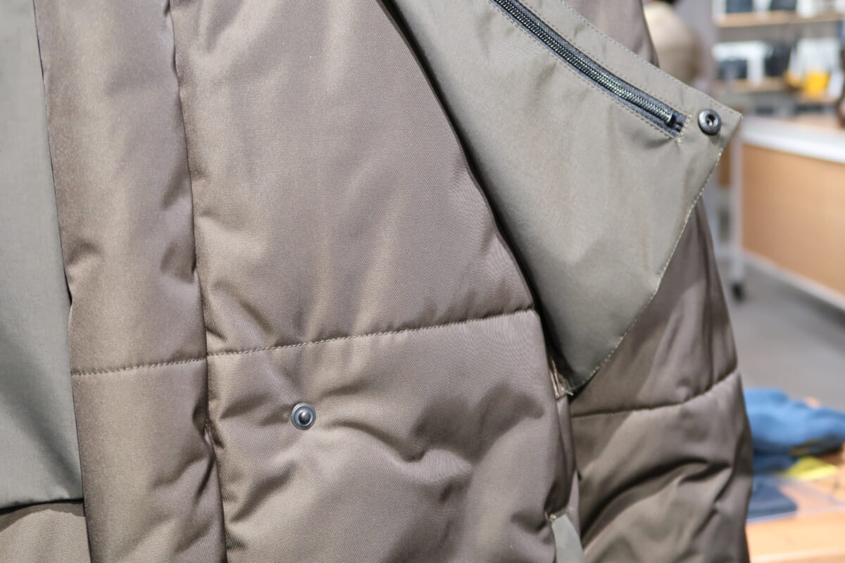 バッグによる摩耗を軽減するため、強度の高いソロテックス高密度ツイルを表地に使い、バッグが触れる肩と背中は3レイヤー生地でトリミング。背中は親水性ポリウレタンを使った透湿生地が採用されているので、アウターを着てバッグを背負っても蒸れにくいのが特徴です。中綿にはパフが封入され、防寒性もばっちり。裏地には静電気の発生を抑える生地を使っています。内側にはループが備わっていて、脱いだ際に小さくまとめてバッグに引っ掛けることができる仕掛けも便利です。