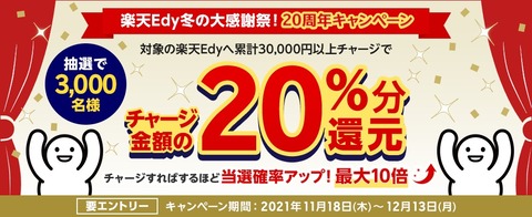 楽天Edyは18日、非接触IC機能「FeliCa」を用いたかざす決済・電子マネーサービス「楽天Edy」において「楽天Edy冬の大感謝祭」キャンペーン( https://edy.rakuten.co.jp/campaign/2021/1118_edycharge20/ )を2021年11月18日(木)0:00から12月13日(月)23:59まで実施すると発表しています。