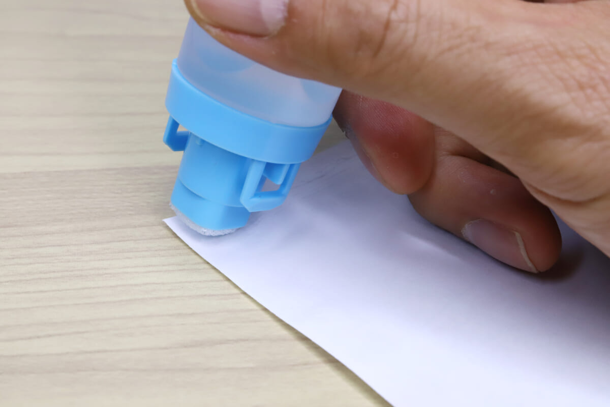 その点、乾燥を気にせずに済むド四角なスポンジヘッドは、圧倒的に強い。ヘッドから均等に染み出す液体のりをズバーッと塗れるので、ムラもなく、かつカドまできっちり行き渡らせられる。これは正直、これまでの液体のりの中でも断トツの使いやすさだ。