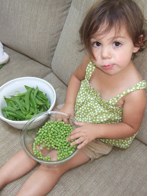 E and I shelled the last peas of the season, and snipped the green beans. Notice E put most of them in her mouth… seriously, this kid loves fresh peas (and her diaper showed it). Loving harvest season.