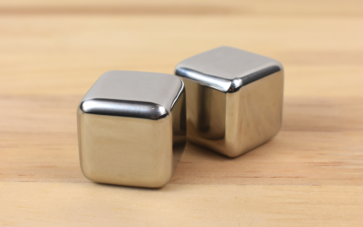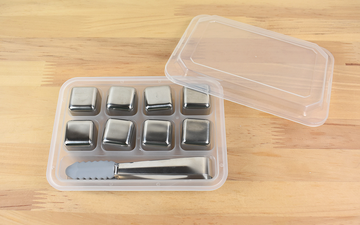 パッケージから出てきたのは、専用保存箱に収まった8個のキューブとトング。ステンレス製で約2.6cm四方のキューブは、サイコロに似ていて、つるんとした美しい見た目が印象的です。手にしてみて驚いたのは、冷やしていたわけでもないのに表面がヒンヤリしていること。4時間ほど冷凍庫に入れてからの使用になりますが、キューブがどれだけ冷えるのか楽しみです。