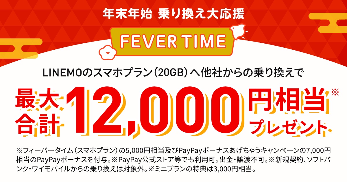 これにより、すでに実施されている「PayPayボーナスあげちゃうキャンペーン」と合わせると最大12,000円相当のPayPayボーナスがもらえます。なお、フィーバータイム特別版!年末年始乗り換え大応援ムはキャンペーンWebページ( https://www.linemo.jp/campaign/fever_time/index.html )から申し込む必要があるとのこと。
