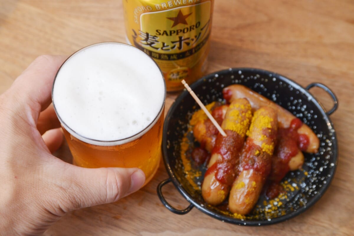 甘酸っぱいケチャップに、スパイシーなカレー粉はつまみのマンネリ打破にもうってつけで、シンプルなソーセージのおいしさに刺激のフックがプラス。マスタードと違うエスニックな辛さは、いまの季節的にも最高です。そして、ソーセージとビール類の相性のよさは言わずもがな。「麦とホップ」も、もちろんドンピシャのおいしさです。