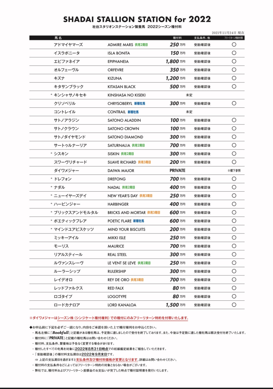1: 名無しさん@実況で競馬板アウト 2021/11/24(水) 16:41:21.58 ID:9IYSkn8C0 社台スタリオンステーション繋養種牡馬の種付料が決定 https://shadai-ss.com/news/info/news-3452/ 一覧 続きを読む