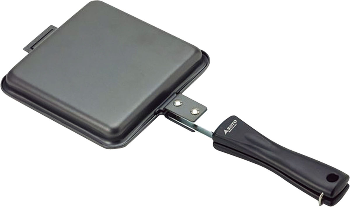 食材を挟んで焼くだけでホットサンドを作れる調理器具。フックを外すと上皿と下皿が分離し、1枚のフライパンとしても使える。キズやサビに強い窒化加工済みで、IHにも対応。