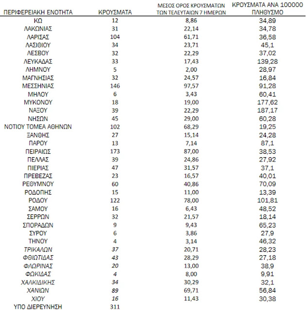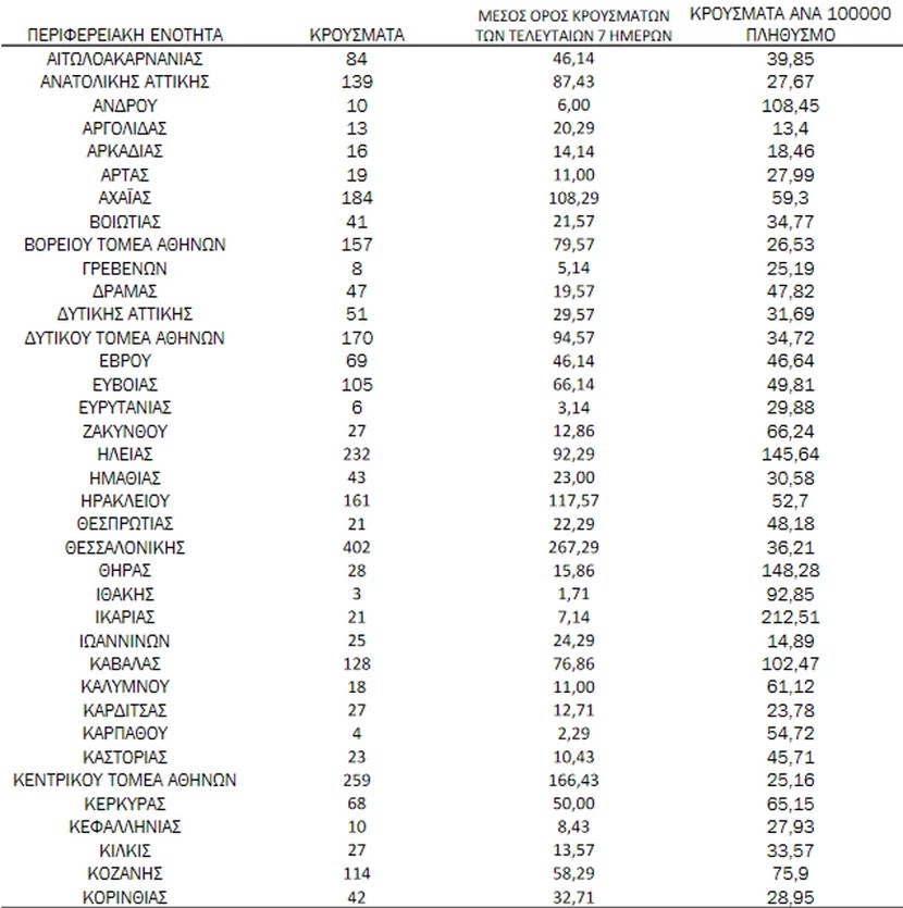 «Τα νέα εργαστηριακά επιβεβαιωμένα κρούσματα της νόσου που καταγράφηκαν τις τελευταίες 24 ώρες είναι 4.608, εκ των οποίων 23 εντοπίστηκαν κατόπιν ελέγχων στις πύλες εισόδου της χώρας. Ο συνολικός αριθμός των κρουσμάτων ανέρχεται σε 566.812 (ημερήσια μεταβολή +0.9%), εκ των οποίων 51.1% άνδρες.