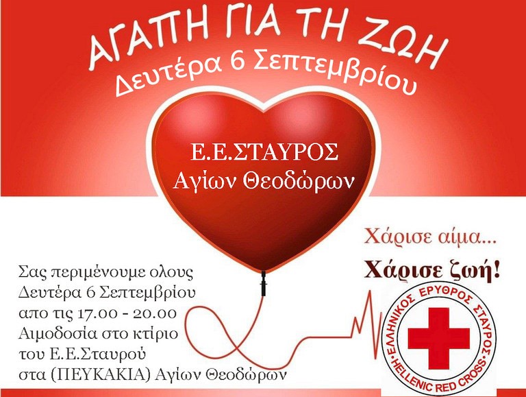 Την Δευτέρα 6 Σεπτεμβρίου 2021 ώρες 17.00 – 20.00 μμ το Παράρτημα του Ελληνικού Ερυθρού Σταυρού ΑΓΙΩΝ ΘΕΟΔΩΡΩΝ Κορινθίας θα πραγματοποιήσει ΕΘΕΛΟΝΤΙΚΗ ΑΙΜΟΔΟΣΙΑ στο κτίριο που βρίσκεται στη θέση ΠΕΥΚΑΚΙΑ ΑΓΙΩΝ ΘΕΟΔΩΡΩΝ.