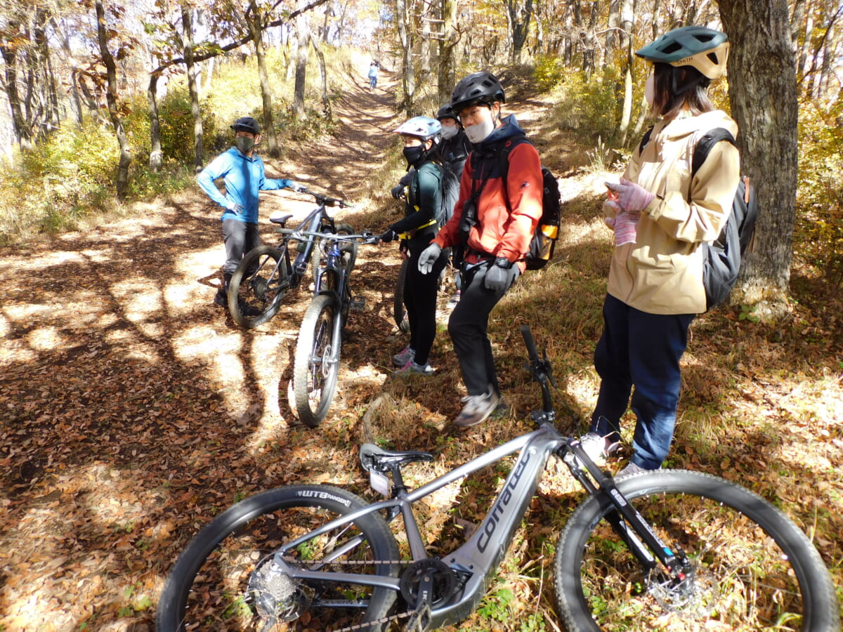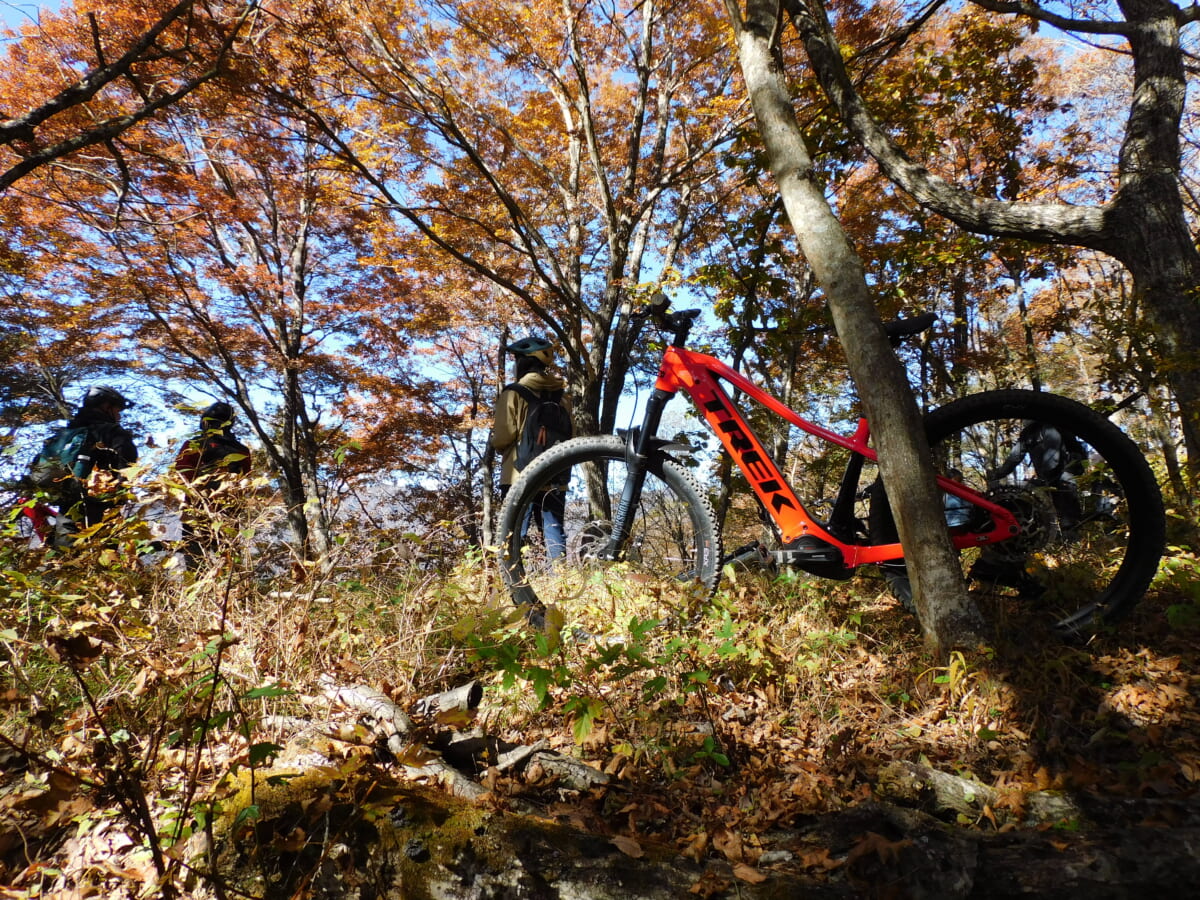 帰路は紅葉に燃える木々の根が露出した荒れた林道を一気に駆け下るダウンヒルを体験。用意された試乗車たちは基本構造がMTBのため、ストローク量のあるサスペンションや剛性の高いフレームが路面の凹凸を吸収してくれ快適でスリリングな走りが楽しめた。かなりハードなルートを走ったことで気が付いたことは、メーカーが異なる各e-Bikeには同型のボッシュ製のアシストモーターが搭載されているのだが、同じスペックでありながらもフレームやジオメトリーの違いによって異なるライド感が味わえたことだ。