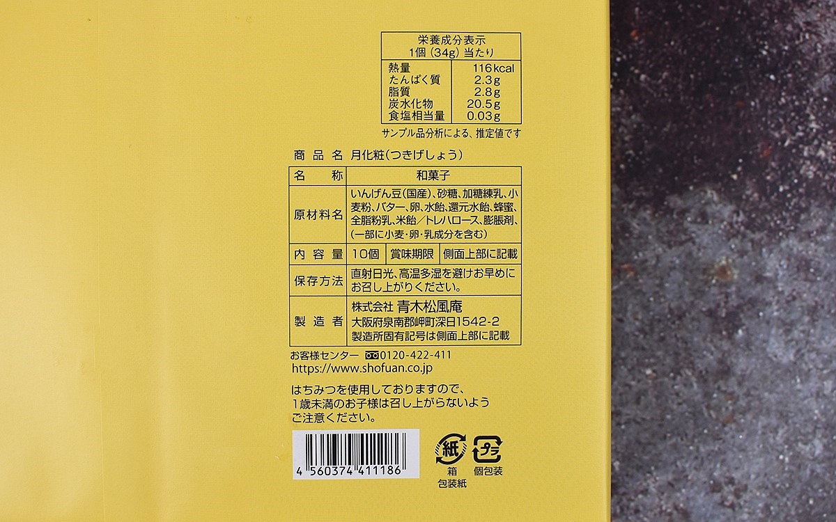 同商品を販売している「青木松風庵」は、昭和59年に創業した和洋菓子店。現在では大阪府と和歌山県に26店舗を構える人気店です。100種類以上の和洋菓子を展開する青木松風庵の商品の中で最も高い人気を誇るのが「月化粧」。パッケージからは高級感が漂っていて、期待が高まります。