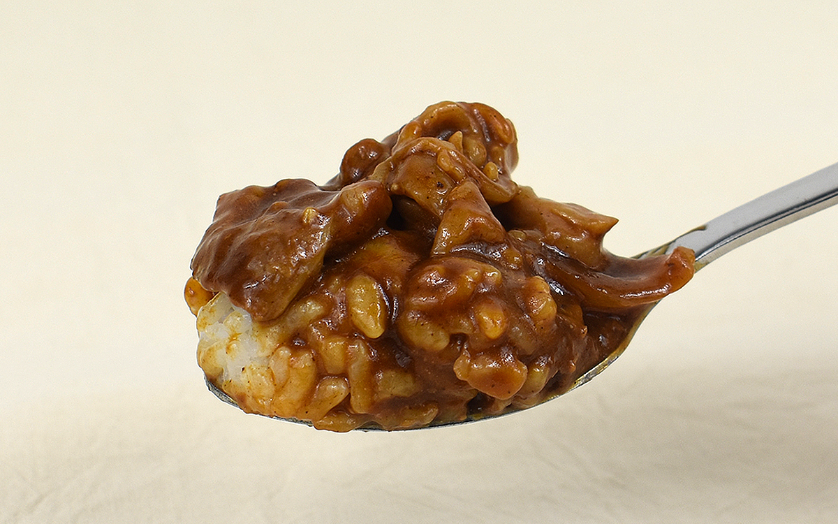 さっそく具材をライスに重ねて口に運ぶと、予想どおりハヤシソースの濃厚なコクが大爆発。ところが最初の2、3口こそ大きなインパクトをもたらしたものの、じっくり味わえば味わうほど優しくなっていく口あたりに驚かされます。ハヤシライスといえばトマト系ソース特有の酸味が印象的ですが、同商品はフレッシュミルクと隠し味のおかげでそれほど強い酸味は感じません。