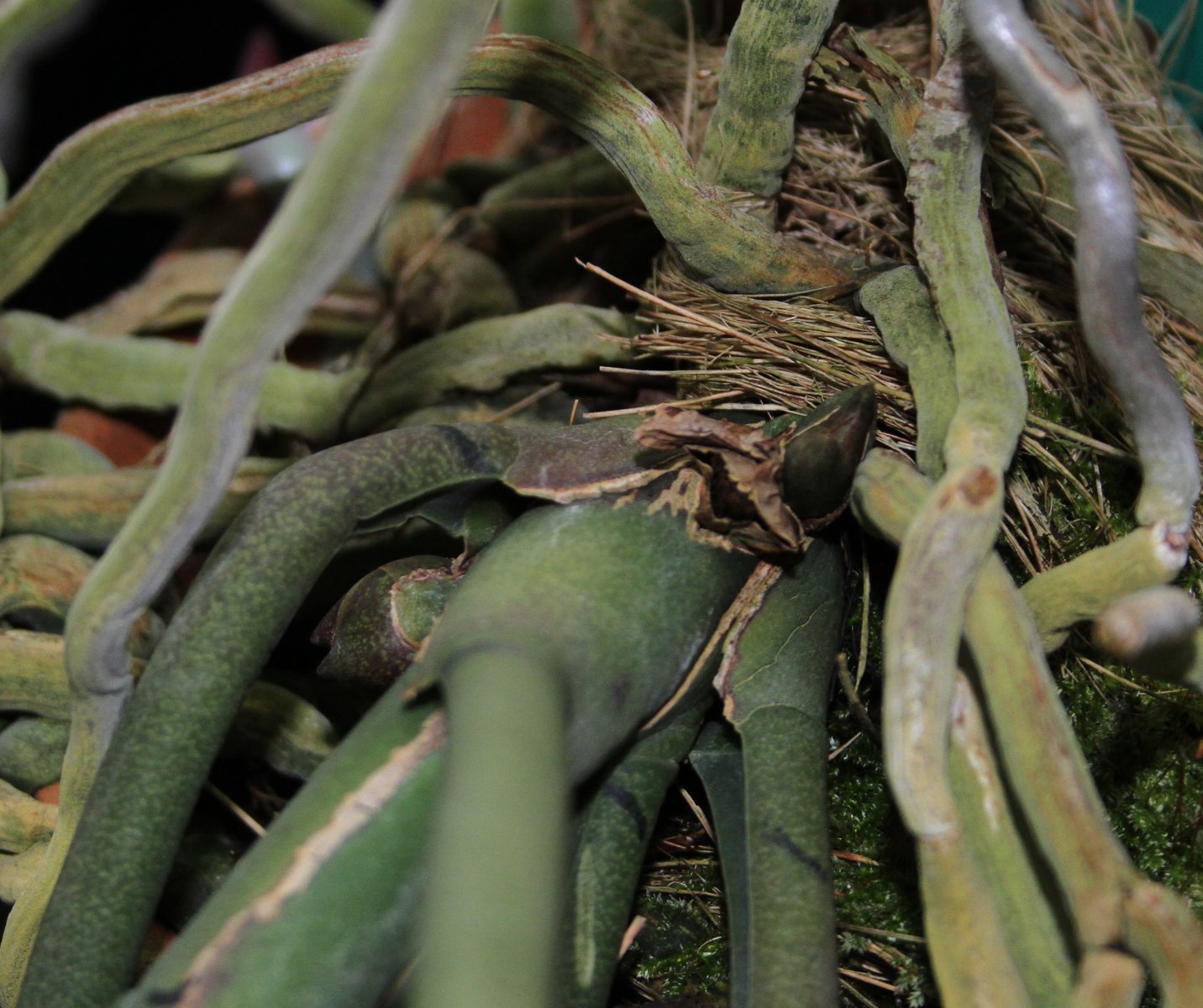 花芽が2本出て来ていますが一本は平たい形をしていることからして子株ではないかと推測しています。 確か前シーズンもそんな推測をしましたが外れたような気がします。